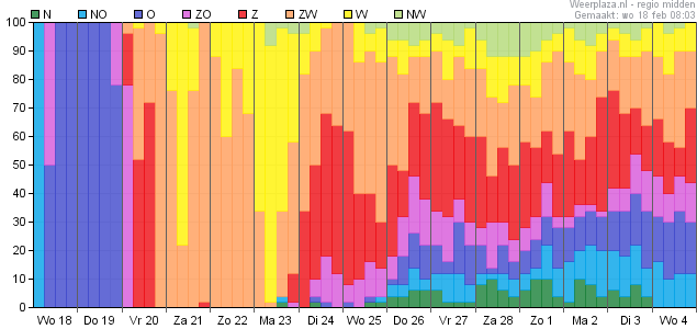 De windrichting is vandaag en morgen oostelijk en gaat gedurende de vrijdag draaien naar zuidwest.