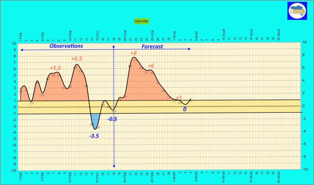 Daarna zet een geleidelijke daling in. De afkoeling verloopt traag en brengt de index begin maart terug naar seizoenswaarden rond 0 tot +1.