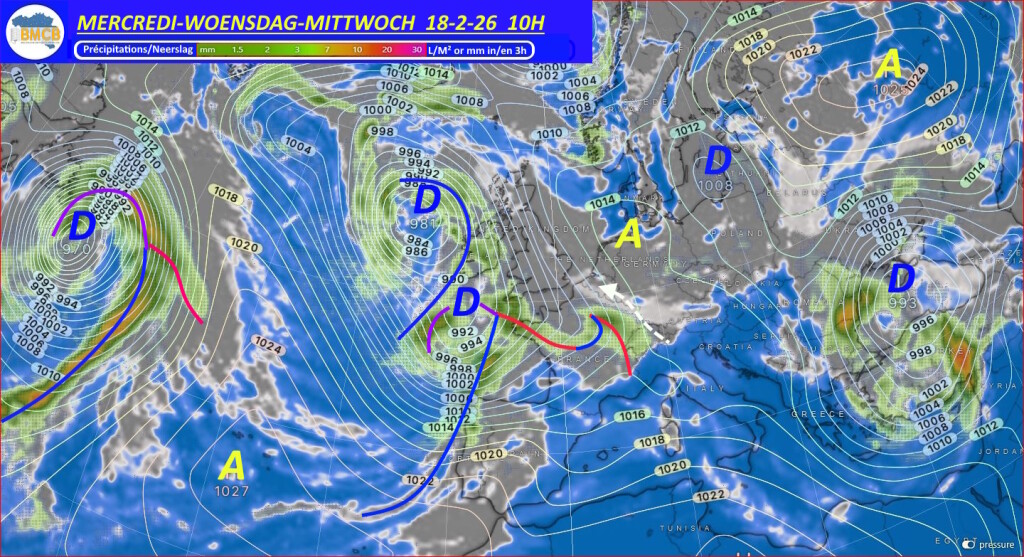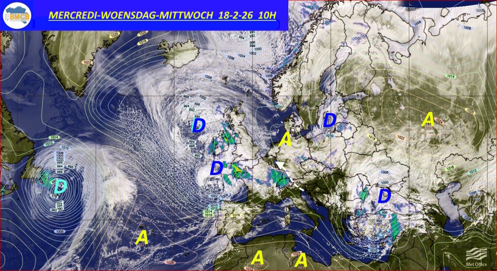 Een depressie van ongeveer 996 hPa trekt donderdag zuidoostwaarts over het noorden van Frankrijk. De bijhorende regenzone bereikt ons land al in de komende nacht met perioden van regen, tijdelijk overgaand in smeltende sneeuw of sneeuw op de hogere delen van de Ardennen.