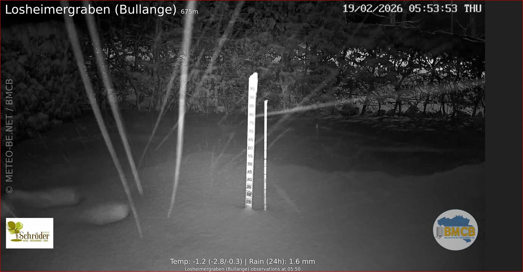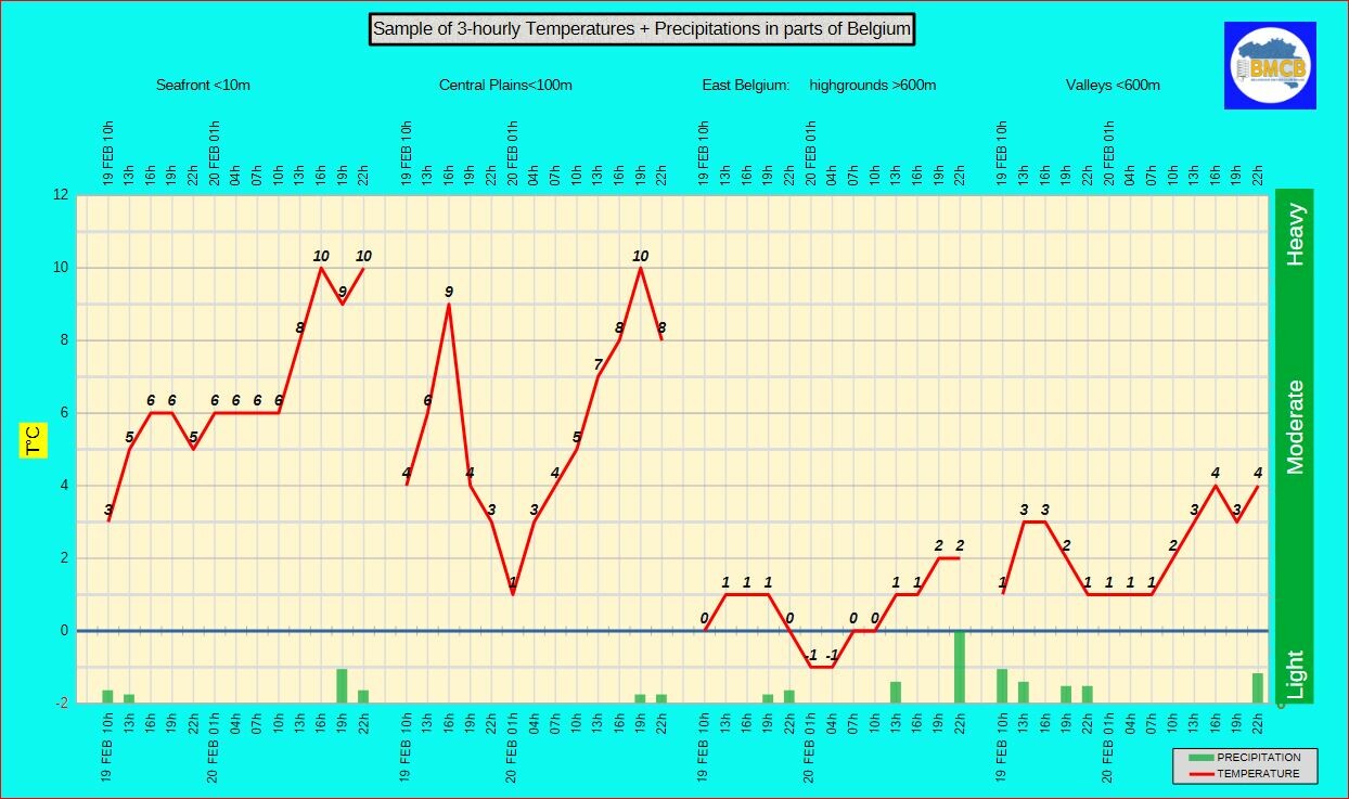 Zeer bewolkt met mogelijk enkele opklaringen in West-Vlaanderen. Lichte regen in Limburg, Luik, Namen en Belgisch Luxemburg. Boven 500 meter in de Ardennen wat smeltende sneeuw mogelijk.