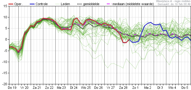 Pas vanaf volgend weekend komt de maximum temperatuur weer onder de 10 graden terecht en zakt de minimum temperatuur volgens de mediaan naar zo'n 2 graden.