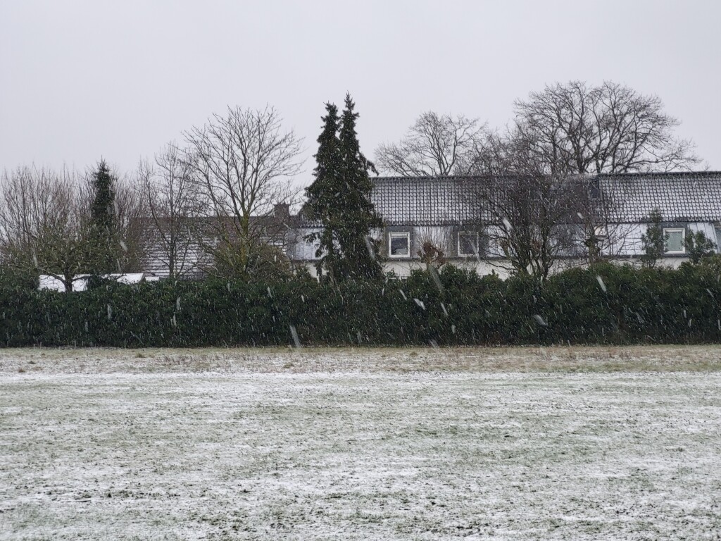 Grasvelden en daken wit(tig), maar trottoirs en straten gewoon nat: