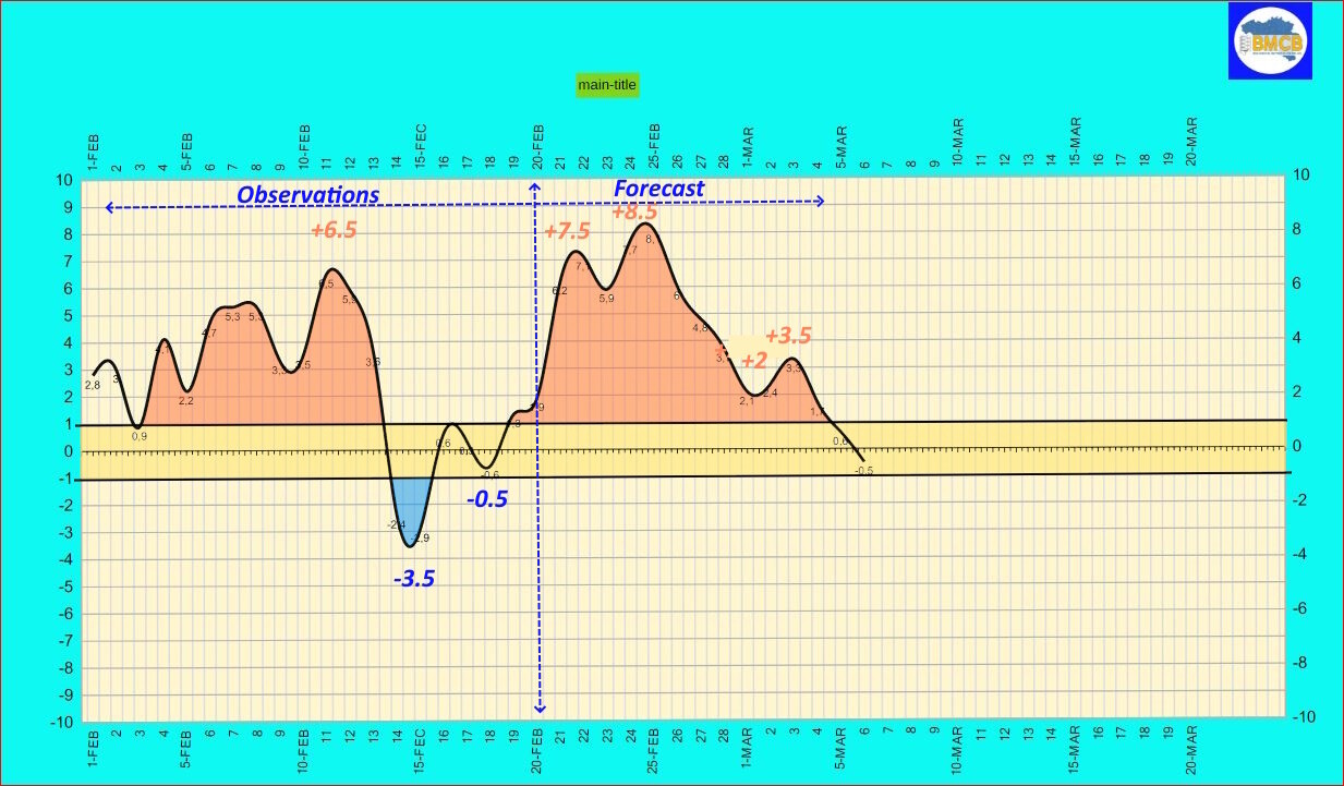 Van 28 februari tot 3 maart zou de indicator terugvallen naar +2 tot +4. De dagtemperaturen keren dan terug naar een bandbreedte van 7 tot 14°C.