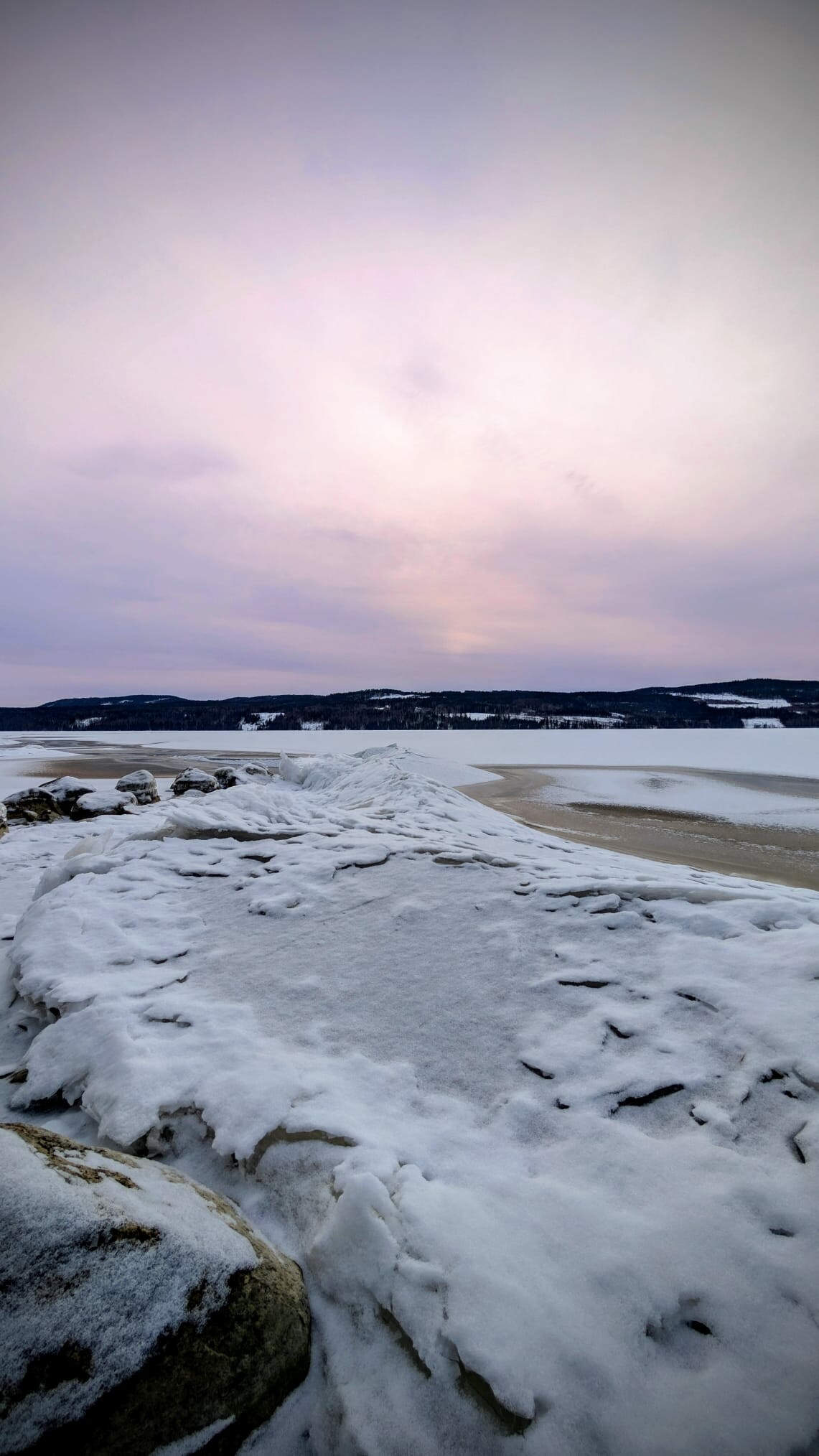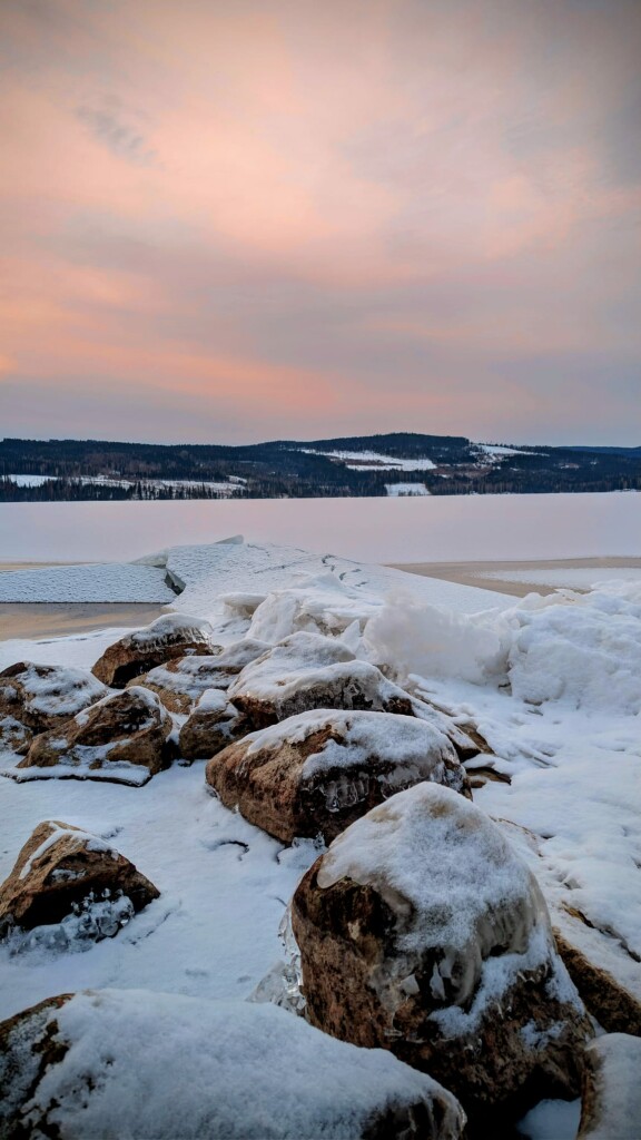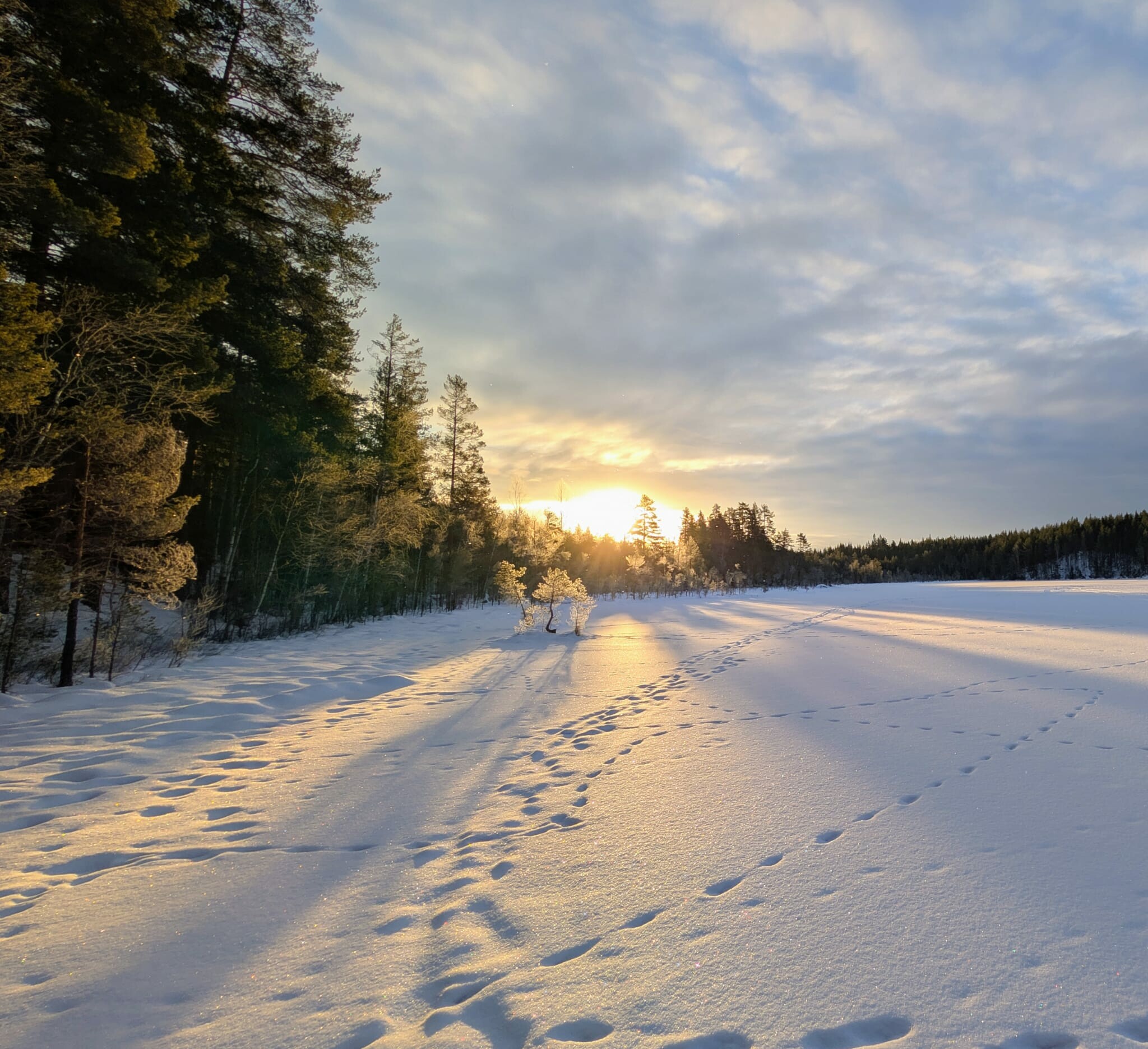 Zonsopkomt bij een meertje in de heuvels rond Torsby bij -18 en lichte sneeuw. Veel dierensporen (eland, ree/hert en vos gezien)