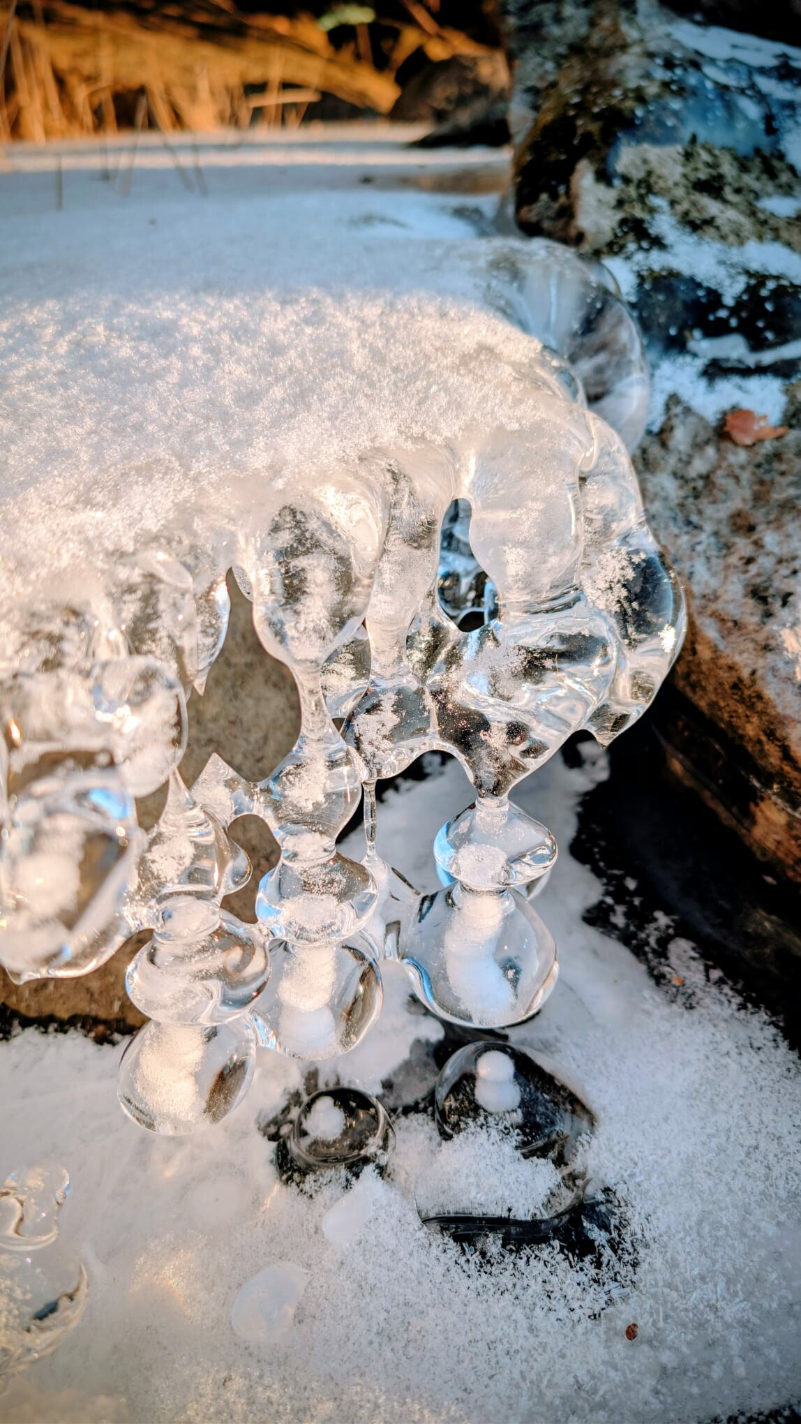 Kruiend ijs voor de deur. Het maakt, zeker bij strenge vorst, enorm veel geluid wat we binnen nog kunnen horen.