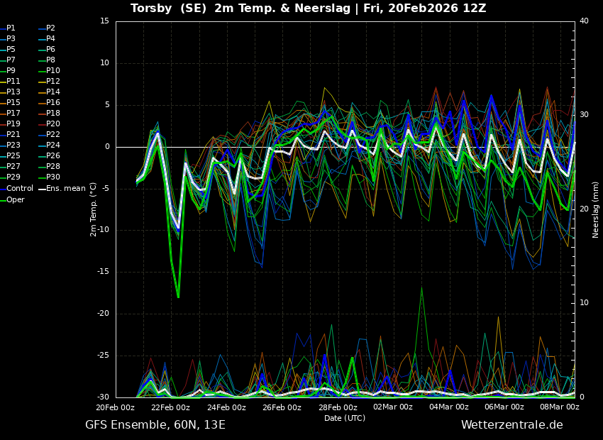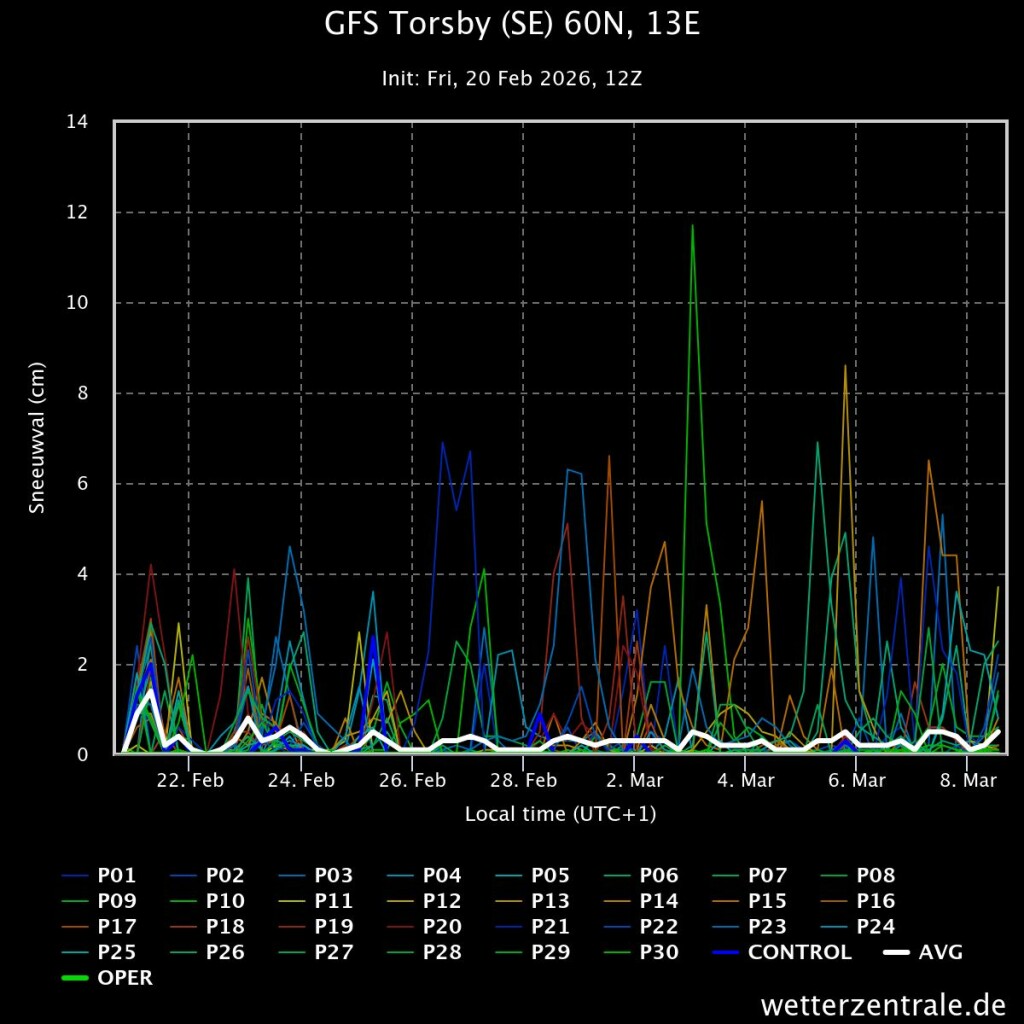 Vanochtend vroeg klapte de wind aan de grond om van noord naar oost, terwijl op hoogte de wind vanuit het zuiden waaide en hoge bewolking aanvoerde. Na een tn van -16,5, schoot de temperatuur omhoog naar -2,5 om 14:00 vanmiddag bij nog altijd een vlagerige wind. De zon scheen er eerst nog flink bij, maar het werd steeds bewolkter door bewolking die vanuit het (zuid)westen werd aangevoerd. Vanavond en vannacht valt er wat lichte sneeuw, maar morgen geeft er zelfs kans op regen aan. Een flinke omslag dus, want gisterochtend was het nog -21 in Torsby en de gemiddelde temperatuur deze februarimaand is -8,8. De omslag gaat geheid gepaard met gladheid natuurlijk, omdat de vorst diep in de grond zit. Daarnaast zal evenutele neerslag later in de middag weer winters worden. Het blijkt een eerste plaagstoot te zijn van de lente, want na woensdag gaat het dan echt lange tijd dooien en regenen zoals het er nu uitziet. Er ligt nu nog 20 sneeuw op 100m hoogte, maar dat zal gereduceerd worden naar een enkele cm tot volgend weekend, als het aan GFS ligt. Daarna lijkt het weer wat kouder te kunnen worden, maar dan is de meeste sneeuw dus weg.