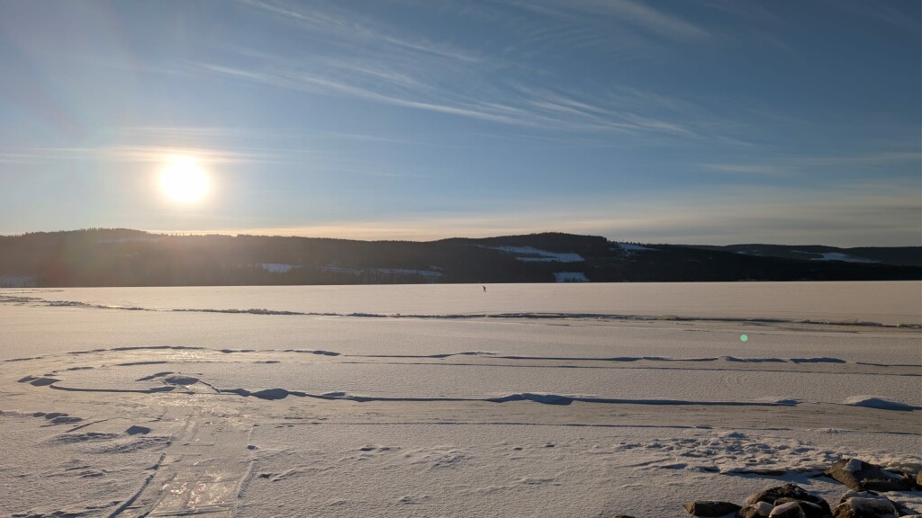 ) die het kruiende ijs trotseert. Het meer is meer dan 100m diep met allerlei stromingen. Doch, kan hij van Torsby naar Sunne schaatsen wat 40km is.