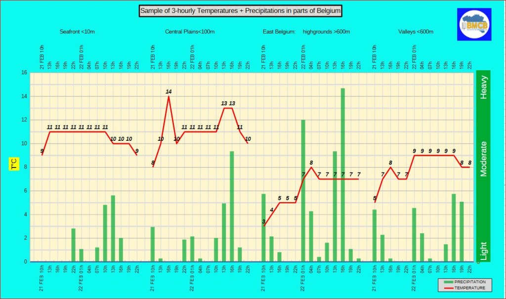 Minima: ±11°C aan zee, 10–11°C in het binnenland, 5–11°C in de Hoge Ardennen.