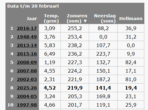 De zonuren staan momenteel op 8 voor de meest zonnige winters. Stond 2 weken geleden op de 4de plaats. Met de laatste 2 weken dus terrein verloren, er komen volgende week nog wel de nodige uren bij maar niet genoeg voor een hogere positie vermoed ik.