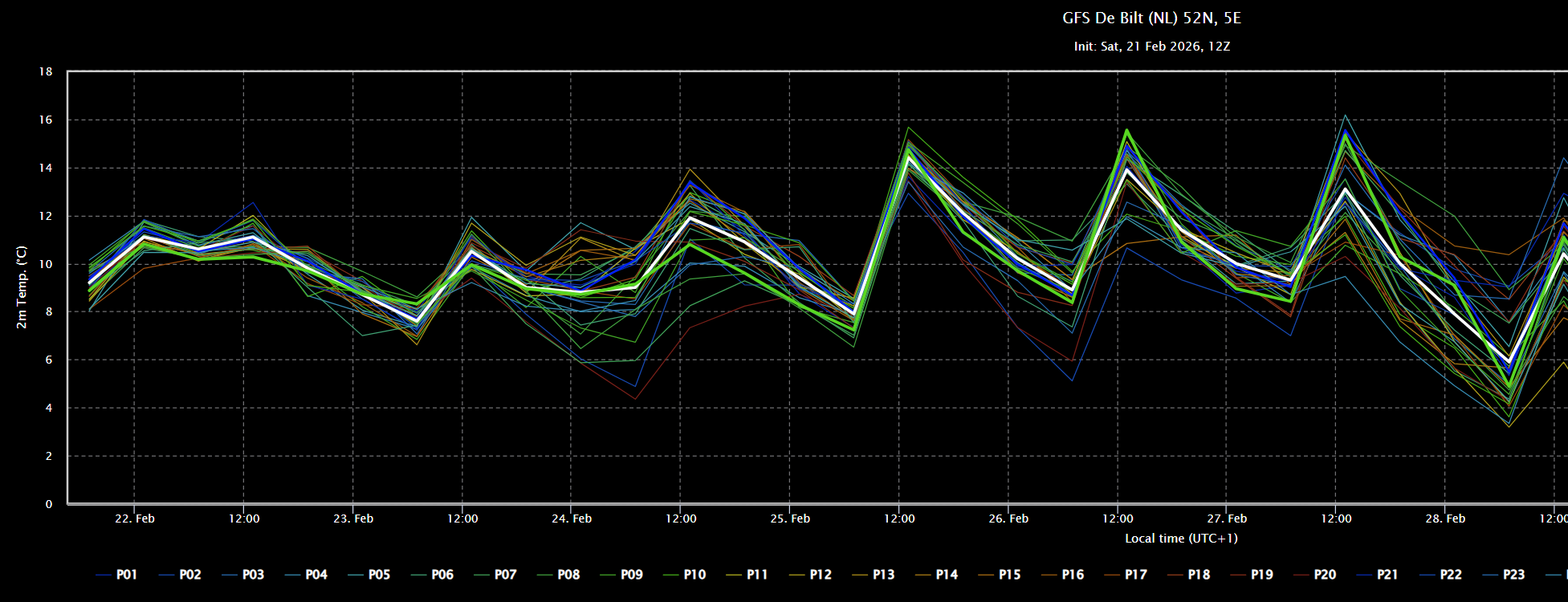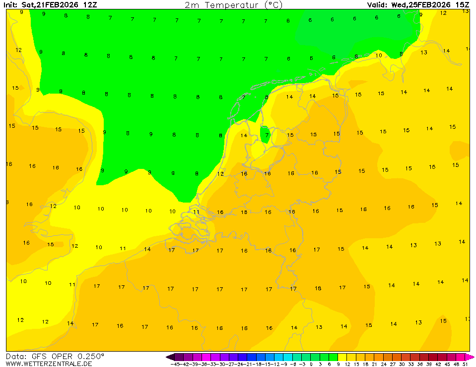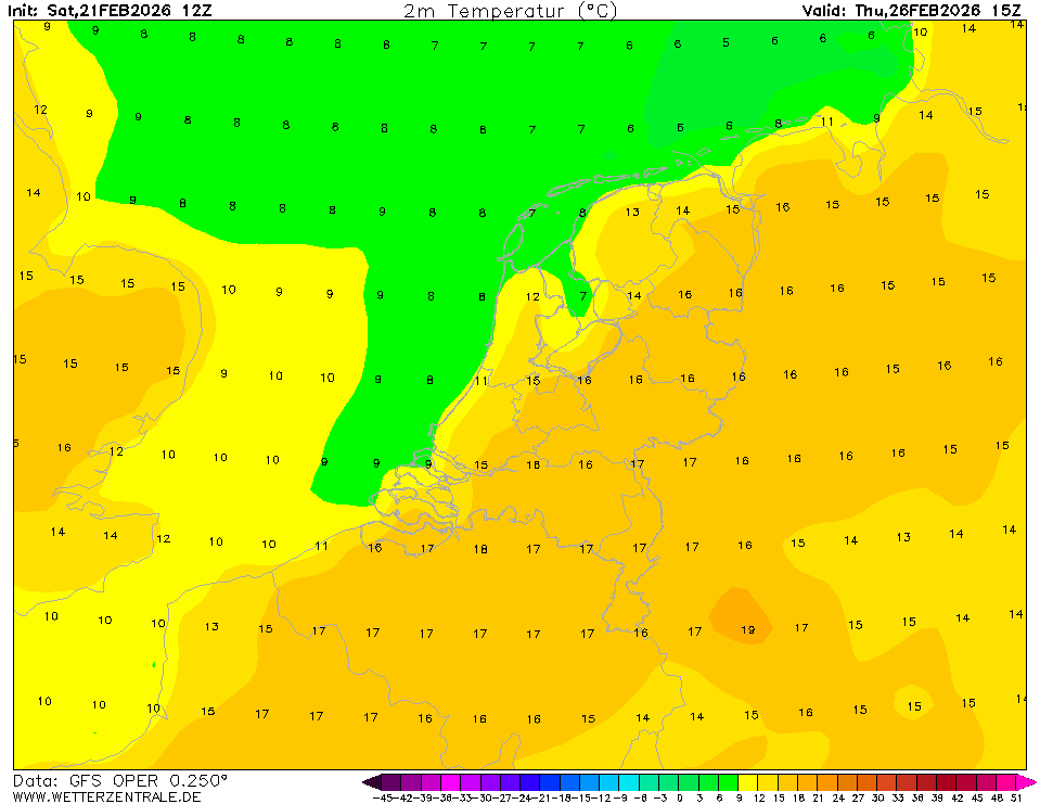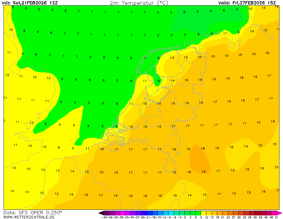 De meeste recente GFS Oper komt met drie zachte dagen op rij, te weten woensdag, donderdag en vrijdag.