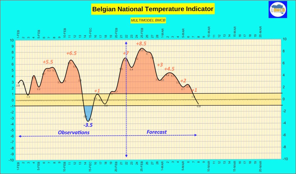 Vanaf 28 februari tekent zich een kentering in het temperatuurregime af. De nationale indicator zou terugvallen naar waarden tussen 0 en +5. De maxima dalen geleidelijk: vanaf 4 maart tussen 6 en 13°C en vanaf 7 maart tussen 4 en 10°C. In de Ardennen wordt de kans op nachtvorst dan opnieuw waarschijnlijk.