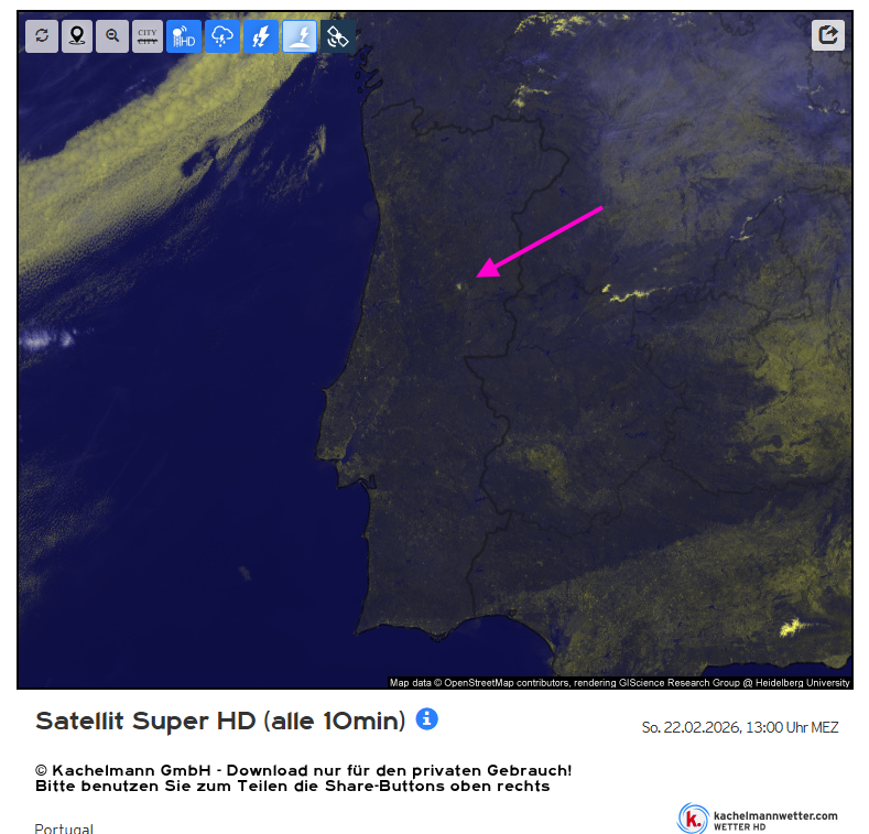 Terwijl het Iberisch Schiereiland ontwaakt uit een lange winterslaap, ligt het hoogste punt (bijna 2000 meter) van continentaal Portugal er nog wit bij. Tegelijkertijd klimt de temperatuur op de warmste stations in het zuidwesten naar zomerse waarden. Ook in Spanje zijn verschillende berggebieden duidelijk op de satelliet te herkennen aan de witte waas, zoals de Sierra Nevada en de Sierra de Gredos.