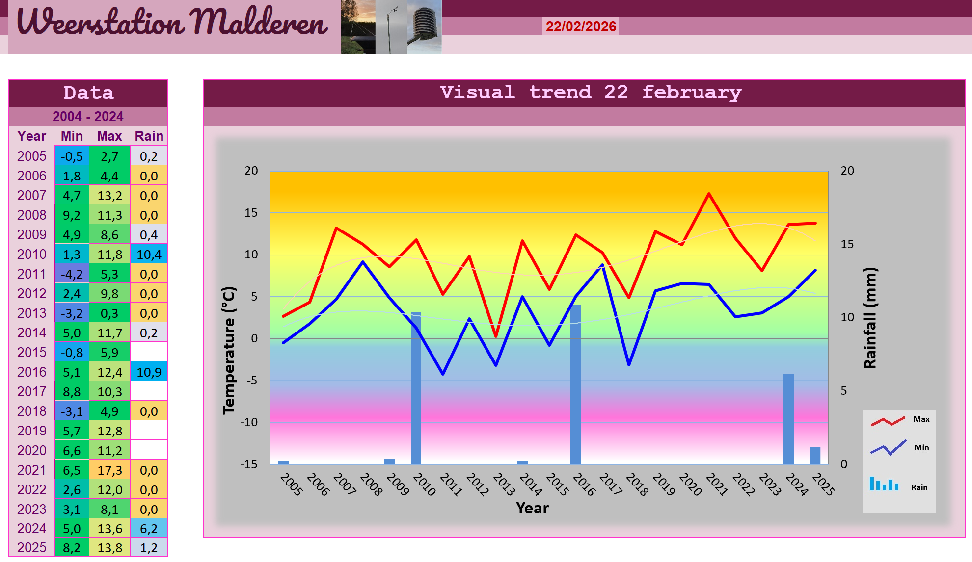 Door de invallende droge landlucht leek het of het vandaag niet meer zou sneeuwen. We kregen een zwaarbewolkte voormiddag met vanaf de middag steeds breder wordende opklaringen vanuit het oosten waardoor de zon stillaan haar intrede kon maken in het weersbeeld. Dankzij de overvloedige bewolking afgelopen nacht was het kwik in een niet al te negatieve stemming waarbij we waarden tussen -0,5 en 2,7 graden registreerden maar de zeer venijnige noordoostenwind tot 58 km/h zorgde er voor dat het guur en ijzig aanvoelde. En de in deze tijd van het jaar volop aan kracht winnende zon was nog niet in staat om daar wat aan te doen, al was het vanachter glas best aangenaam vertoeven tot plots toch nog een reeks pittige sneeuwbuien vanuit het noordoosten het land binnen denderde. Aanvankelijk bleef het witte goedje niet liggen, maar in de loop van de avond hebben verse sneeuwbuien een stabiel sneeuwdekje gevormd te Malderen. Wellicht bedraagt de neerslag meer dan de gemeten 0,2 mm vermits de sneeuw in de pluviometer niet meer als neerslag herkend wordt. Op de weerkaarten heeft zich een blokkade gevormd waarbij een hogedrukgebied ten noordwesten van ons voor anker is gegaan en de storingen in een ruime bocht om zich heen leidt. Ze worden echter tot over onze streken meegesleurd waardoor er vooral op woensdag nog sneeuwval van betekenis kan aan te pas komen