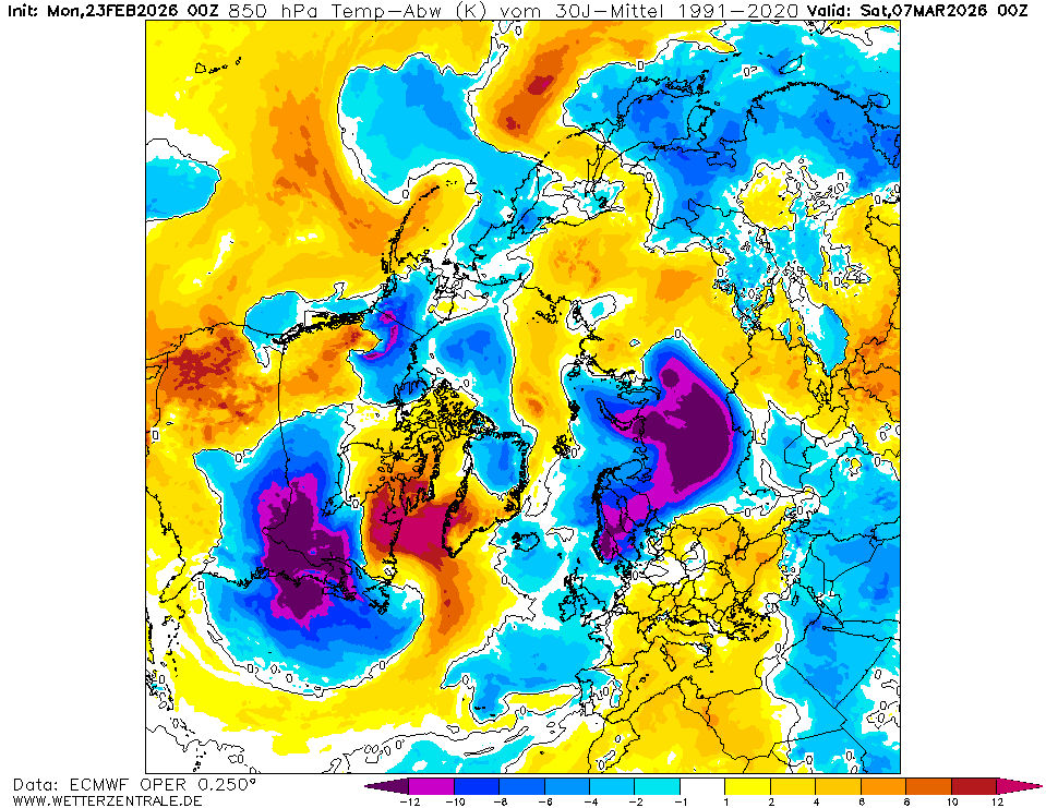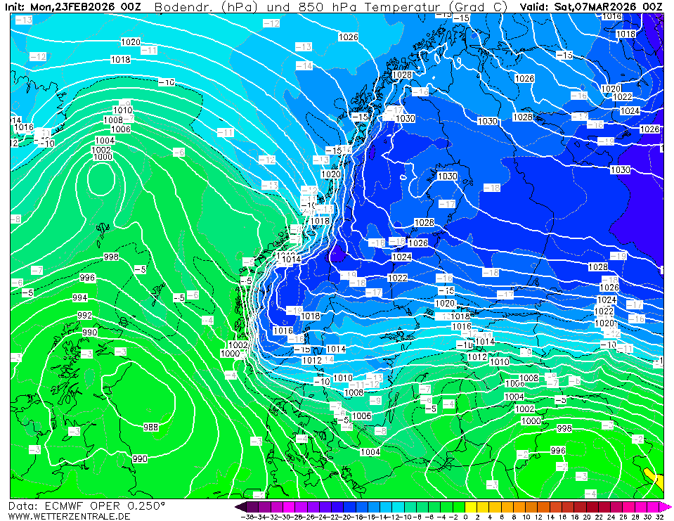 Hier zien we dat de koude lucht Scandiland bereikt.