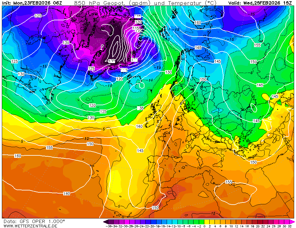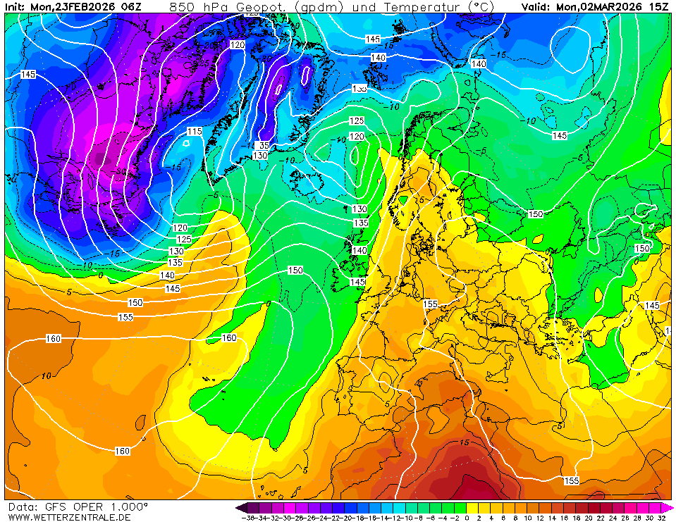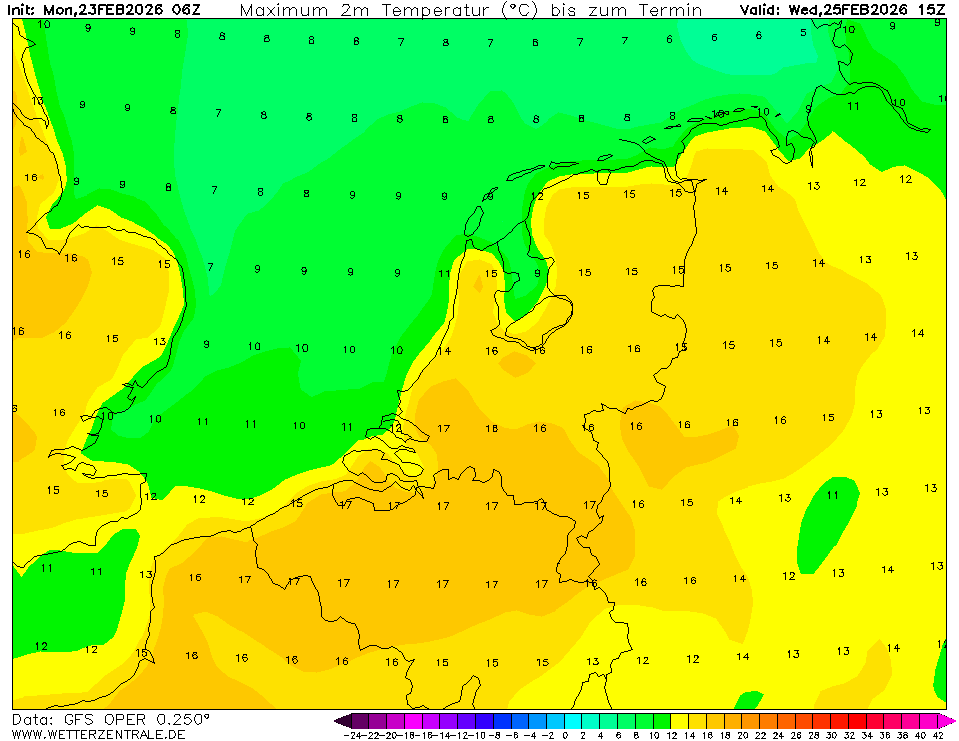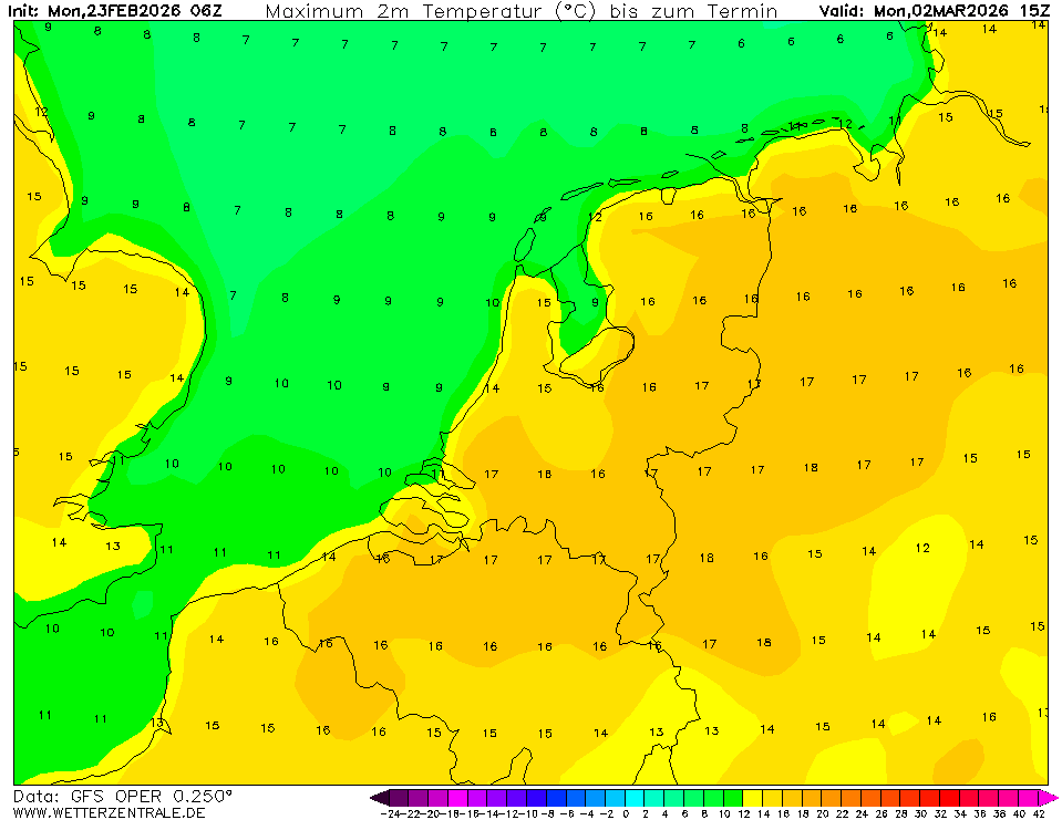 In beide gevallen krijgen we te maken met een zuidelijke aanvoer waarin de temperatuur oploopt naar zo'n 17 graden voor locatie De Bilt.
