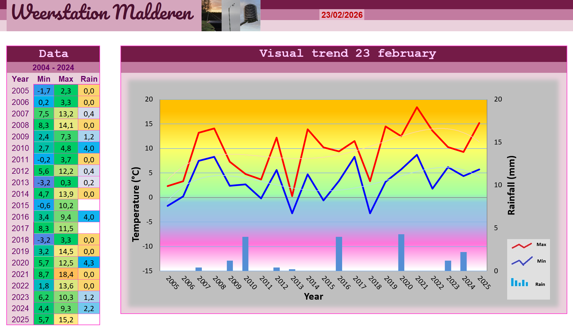 Brede opklaringen bepaalden vanochtend het weersbeeld. Een beeld dat overigens snel zou veranderen want er kwamen vanuit het zuidwesten buien opzetten die bij hun nadering de bewolking aardig deden toenemen. De buien toonden echter niet alteveel interesse in Malderen want op het einde van de dag was er nog maar 0,4 mm bijgekomen. We moesten het eerder hebben van fraaie wolkenluchten die de hele dag door voor de nodige animatie zorgden. De bewolking nam in de late namiddag tijdelijk verder toe maar dit leverde geen verdere gevolgen meer op. De temperaturen zaten terug zeer hoog met 7,5 tot 13,2 graden terwijl de zuid- zuidwestelijke wind vrij pittig was met snelheden tot 38,6 km/h.