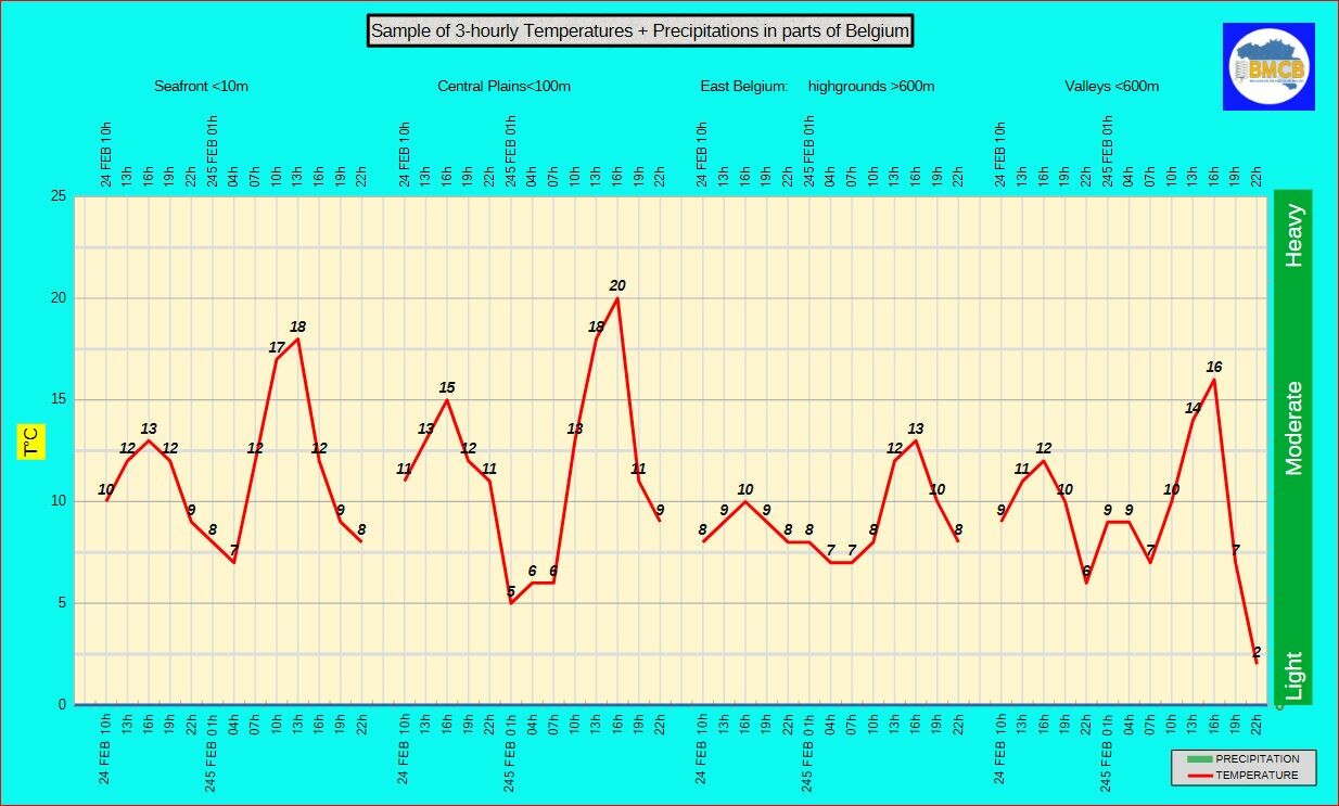 De maximumtemperaturen stijgen verder tot ongeveer 18 °C aan de kust, 17 tot 20 °C in het binnenland en 13 tot 16 °C in de Ardennen.