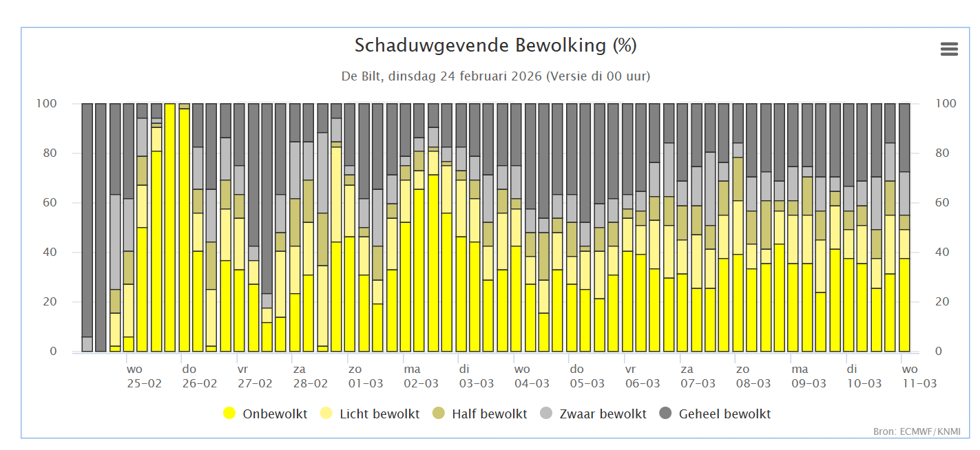 Vooral de bewolkingsgrafiek maakt mij blij, ik zie eigenlijk elke dag wel prima zonkansen, de echte grijze dagen lijken even achter ons te liggen.