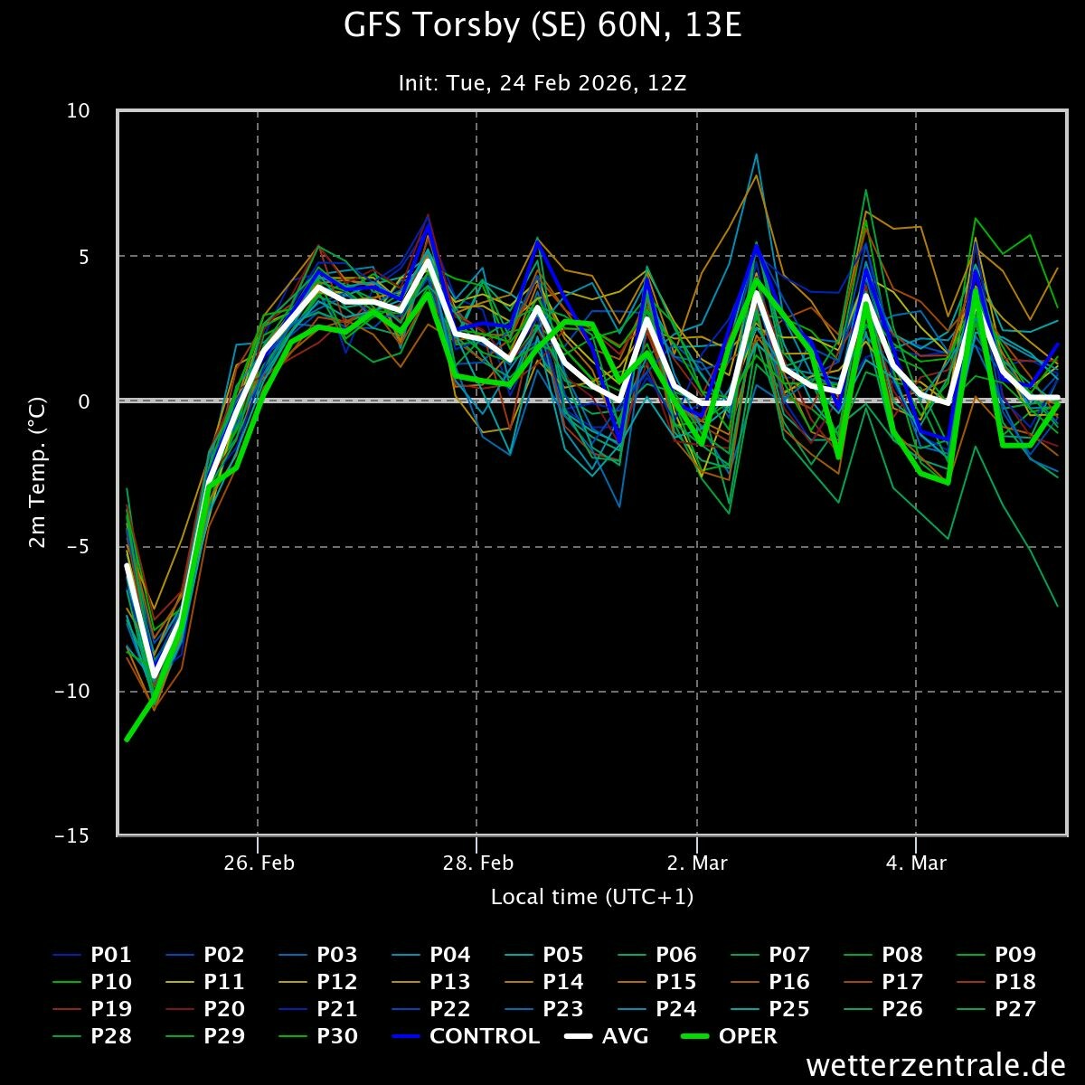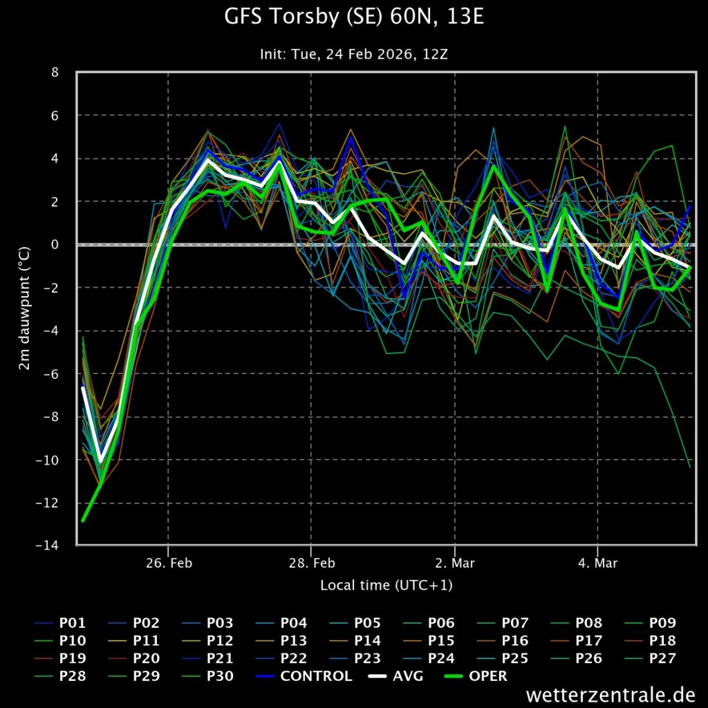 Morgen een klein beetje sneeuw op de overgangsdag naar zachter weer en daarna regelmatig wat regen. Met veel geluk kan vanaf het weekend in de nacht en ochtend de 2m temperatuur/dauwpunt weer onder nul komen en na 4 maart komt het gemiddelde dauwpunt weer onder 0 graden. Hopelijk vriest het in de nachten dan hard genoeg om de boel weer op te laten vriezen.
