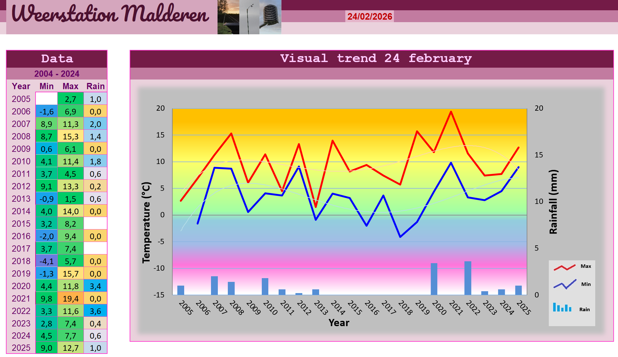 Tijdens de nachtelijke uurtjes is het alleen maar verder opgewarmd waardoor de temperaturen reeds waren opgelopen naar 4,5 graden omstreeks 5H. De minima werden reeds kort na middernacht opgetekend en bedroegen 3,7 graden. Op thermisch gebied werd het een aangename dag met lentetrekjes, maar het weertype dat erbij hoorde deed eerder aan een druilerige herfstdag denken met veel Stratusbewolking en rond de middag tijdelijk mist die het zicht beperkte tot een 1000-tal meter. Ondanks het saaie weer zagen de analysekaarten er weer indrukwekkend uit door de grote temperatuurscontrasten tussen het noorden en zuiden van de Benelux. Zo werd het in Malderen maarliefst 10,3 graden kort na de middag terwijl het noorden van Nederland op hetzelfde moment op amper een graad boven het vriespunt bleef steken. Over het westen en centrum van Europa waren de temperatuursverschillen nog indrukwekkender, al lijken de scherpste kantjes van het winterweer er stillaan af te gaan. Daar waar het ten oosten van Polen een paar dagen geleden nog bijna -30 graden was, was het er nu reeds stukken zachter geworden bij temperaturen tussen -15 en -20 graden. Op het einde van de avond zagen we de Stratusbewolking in Malderen geleidelijk weer oplossen en kregen we eventjes de sterren te zien terwijl het lichtjes ging afkoelen. De motregen die vandaag is gevallen heeft het neerslagtotaal laten uitkomen op 0,6 mm.