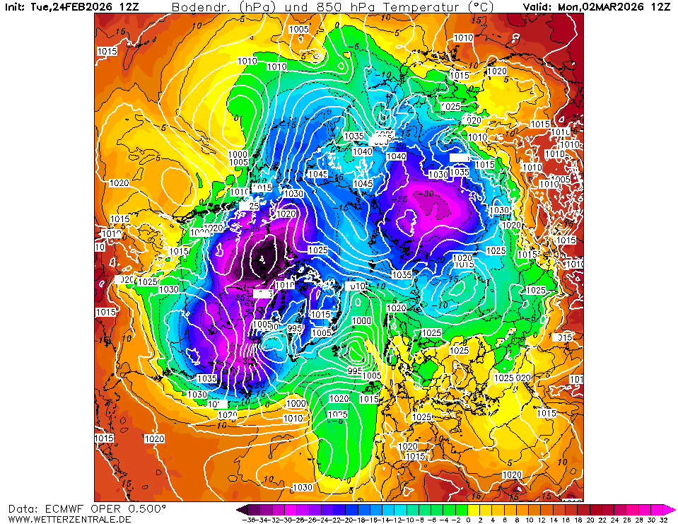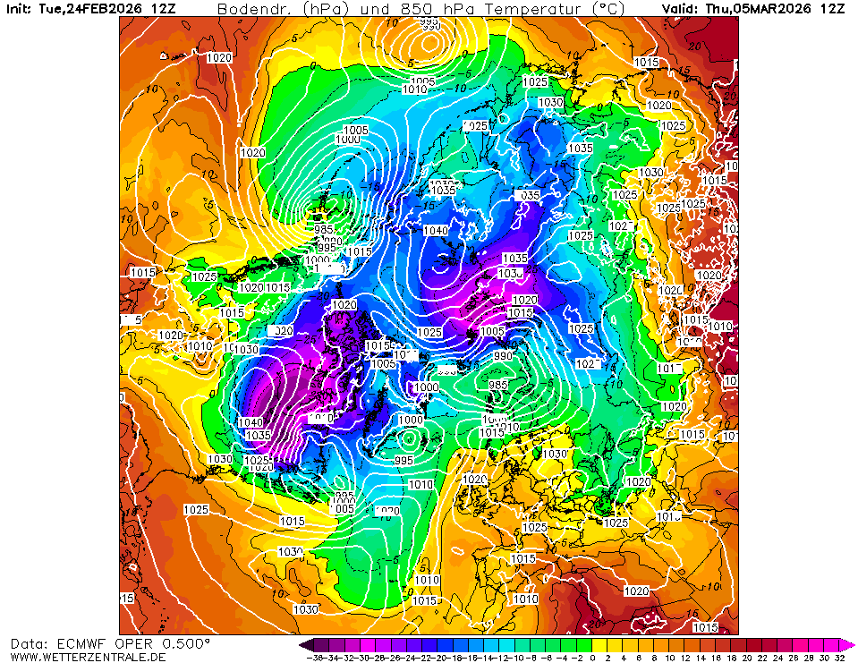 Net als bij GFS, zie je dat de koudste Siberische lucht de 'verkeerde' kant op gaat.