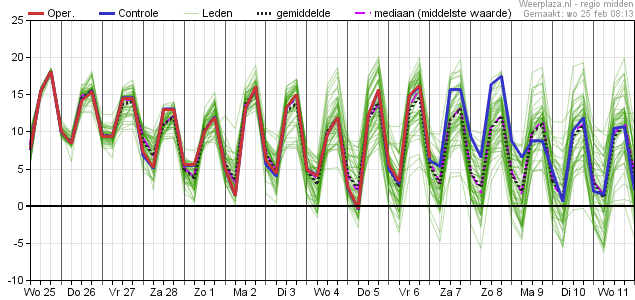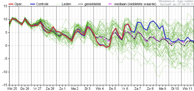 In de dagen daarna gaat de temperatuur op en neer tussen de 12 en 16 graden en pas in de laatste fase van de pluim (vanaf 8 maart) zakt de mediaan tot iets onder de 12 graden.