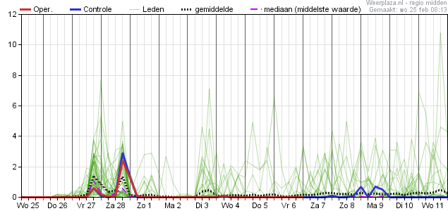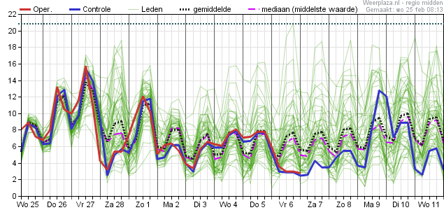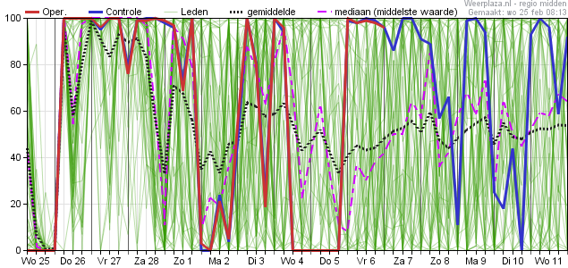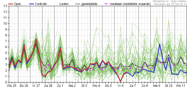 Wel is er vanaf 4 maart behoorlijk wat spreiding zichtbaar, wat aan geeft dat e.e.a. nog onzeker is voor het exacte verloop.