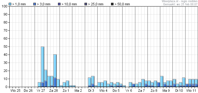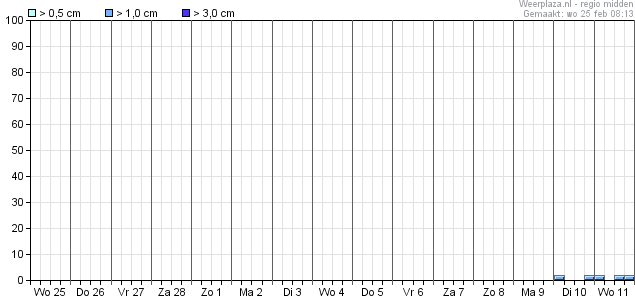 Met maart op de kalender is er vrijwel dagelijks een neerslag signaal te zien, maar de hoeveelheden zijn gering.