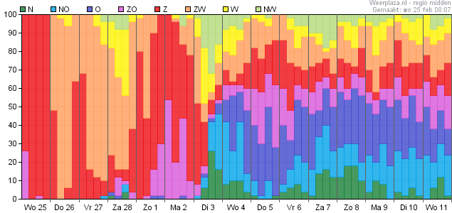 Op dinsdag gaat de wind draaien (over noord) naar noordoost op woensdag en dan naar zuidoost op volgende week donderdag en vrijdag.