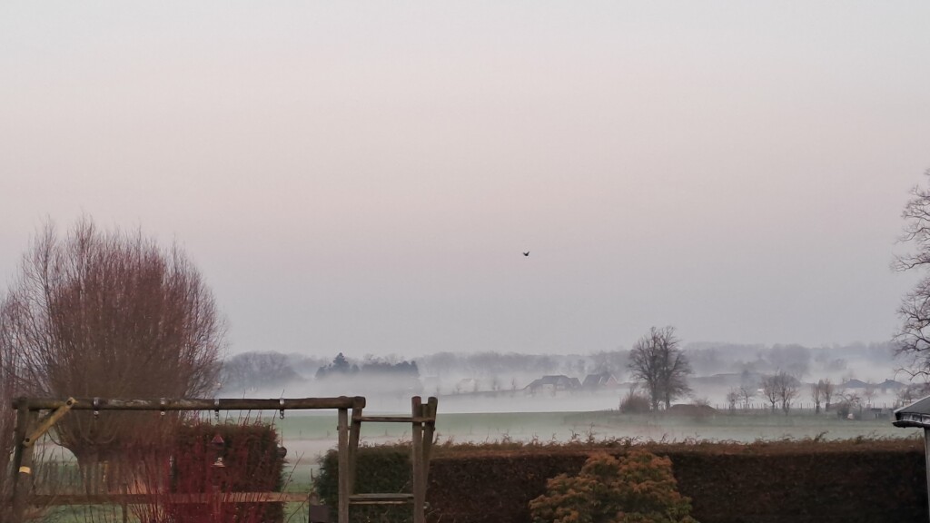 goedemorgen, Tact 7.7°, helder, nevel in de valleien, ZZW-wind,