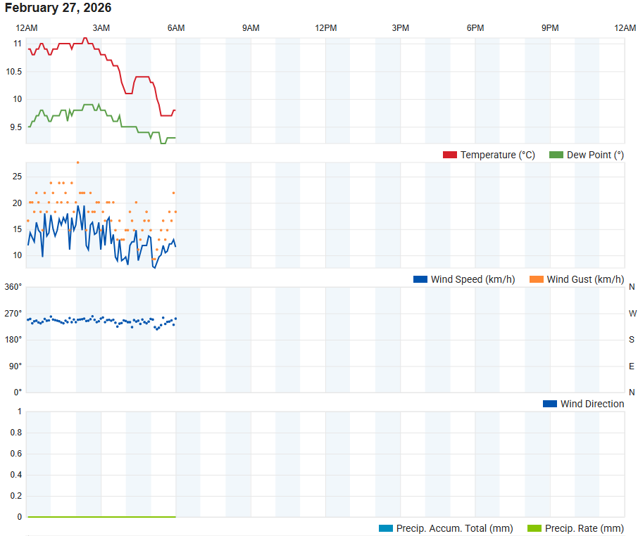 Een 'lauwe' winternacht achter de rug: Tn 9,7°CTact 9,8°C. Daarbij is het droog en lichtbewolkt. RV 92%, wind ZW 3 Bft, luchtdruk 1013 hPa.