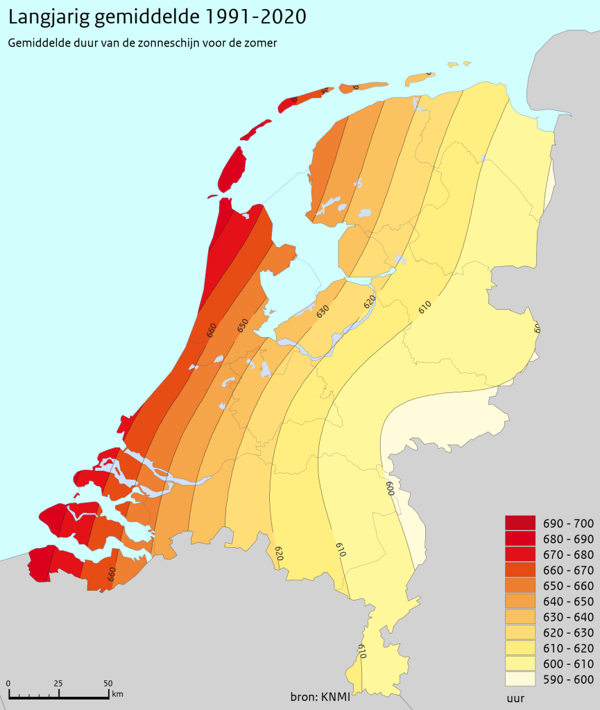 in het voorjaar en de zomer. Den Helder het zonnigst.