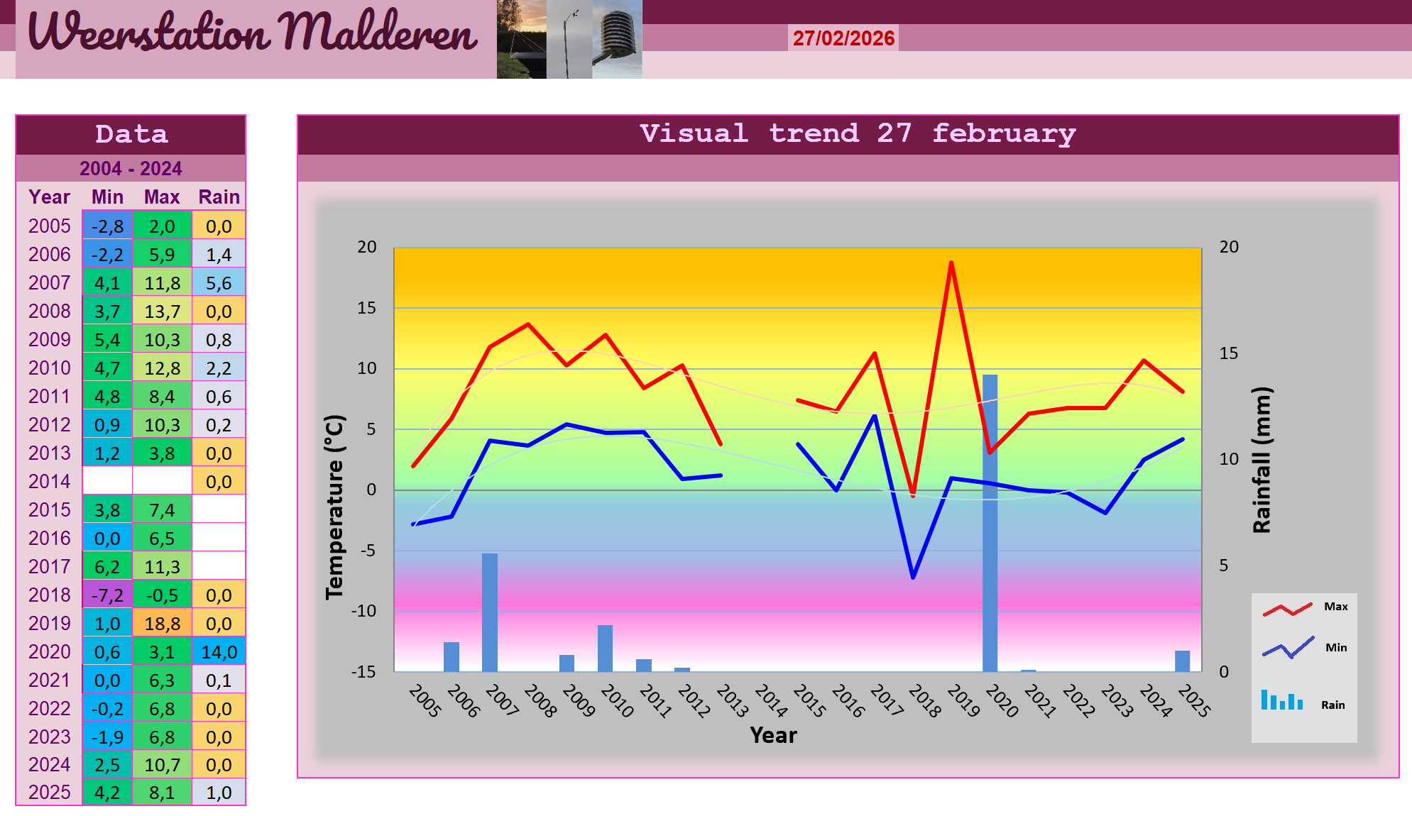 De afkoeling zette zich tijdens de nachtelijke uurtjes geleidelijk verder door, maar door de talrijke wolkenvelden konden we het vorstvrij houden bij minima van 4,8 graden. Vooral tijdens de voormiddag werd het fraai lenteweer met flink wat zon, een afwisseling van Cirrostratus, Stratus fractus en Cumulus en een naar 8,4 graden oplopende temperatuur. Daarna kwam een opgekruld occlusiefront vanuit het noordoosten wat dichterbij zodat we de bewolking vanuit die hoek weer zagen toenemen. Deze storing zorgde in Nederland voor regen, smeltende sneeuw en tijdelijk zelfs droge sneeuw waardoor een nieuwe invasie van sneeuwmannen er onvermijdelijk was bij een sneeuwdekje tot 3 centimeter en temperaturen net boven het vriespunt. In Malderen liep/gleed het zo'n vaart niet en bleef het opmerkelijk zachter bij temperaturen die rond 6 graden bleven schommelen. Er viel hooguit wat motregen uit de Stratus fractus, Altostratus en Cumulusbewolking al deed het nog niet echt aan lente denken met die snijdende noordwestenwind tot 33,8 km/h erbij. De bewolking trok zich op het einde van de namiddag weer terug naar het noordoosten waardoor we fraaie opklaringen te zien kregen en we een licht tot halfbewolkte avond ingingen. Op het einde daarvan konden we het neerslagtotaal van 0,6 mm optekenen.