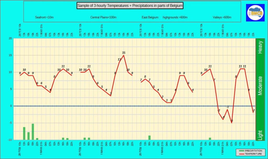 Minimumtemperaturen: ongeveer 4°C aan de kust, 3 tot 5°C in het binnenland, 1 tot 3°C ten zuiden van de Samber-Maas-as en 0 tot –5°C in de Ardense valleien.