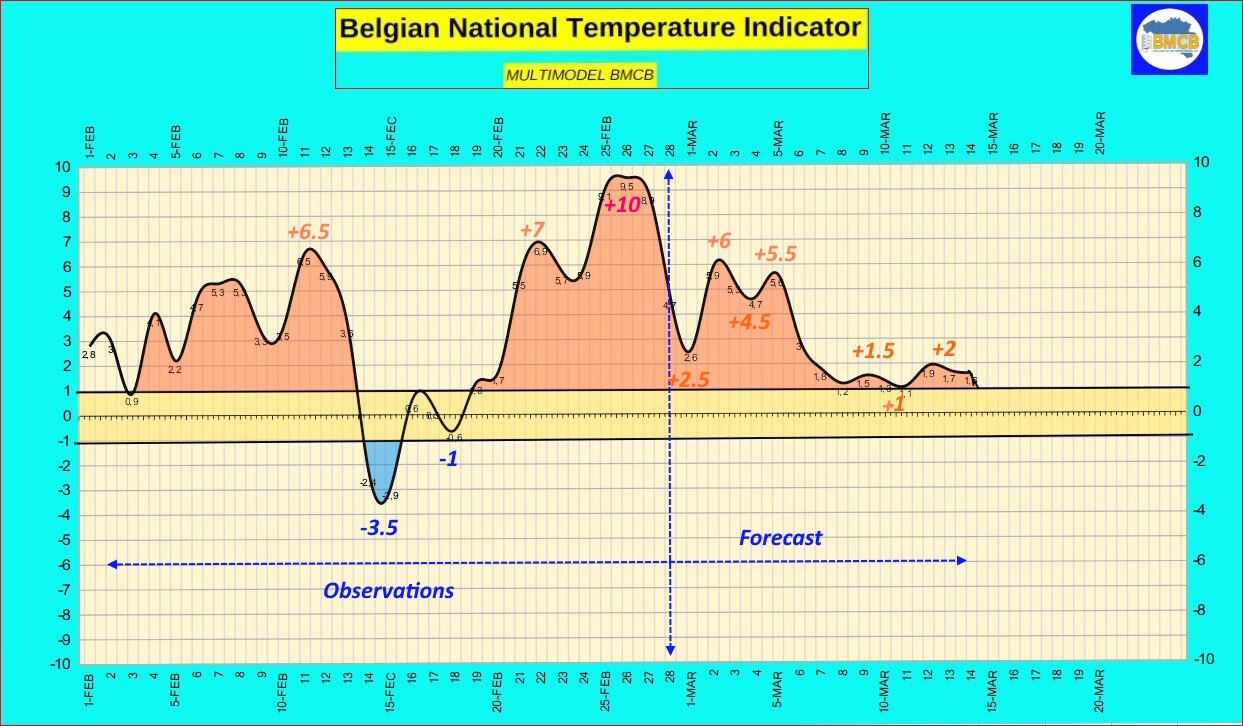 De thermische indicator zou geleidelijk terugkeren naar waarden tussen +1 en +2. De maxima zouden dan meestal tussen 8 en 15 °C liggen, wat bevestigt dat het temperatuurniveau nog steeds licht boven de seizoensnormen blijft, ondanks een relatieve afname van de zachtheid.
