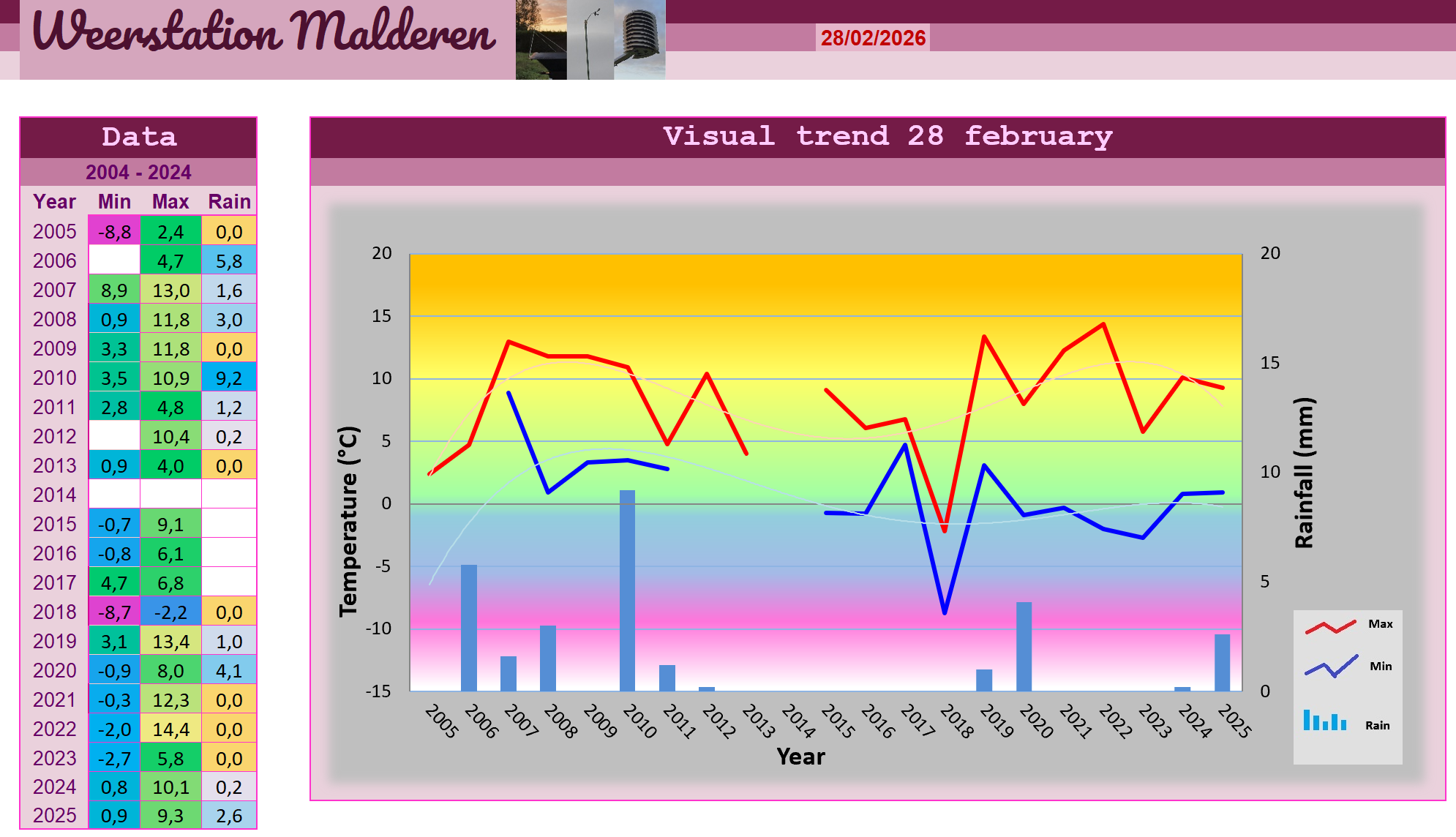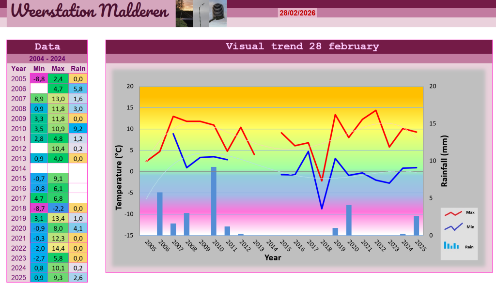 De reeds vele dagen op voorhand voorspelde en berekende storm heeft vanochtend uiteindelijk vorm gekregen, wat niet onopgemerkt voorbijging. De snel uitdiepende depressie die onder de naam Xynthia het levenslicht zag, begon haar verwoestende tocht boven Spanje en trok in de loop van de voormiddag België in. Het toeval wilde echter dat Malderen zich maar net ten oosten van de kern bevond waardoor we aan de sterkste windvelden ontsnapten. De regen was er echter niet minder om en deze hield reeds sinds afgelopen nacht aan waardoor we de dag onder Nimbostratus bewolking aanvatten. De wind kwam aanvankelijk uit zuidelijke tot zuidoostelijke richtingen, zwakte tijdens de passage van de kern rond de middag flink af, en wakkerde vervolgens weer flink aan. Hierbij viel de sterke windsprong op naar westelijke tot noordwestelijke richtingen, en natuurlijk ook de winsnelheden die ondanks onze gunstige positie tegenover de depressiekern opliepen tot een forse 61,2 km/h uit het westen. Ook de sterke temperatuur sprongen waren opmerkelijk, zo warmde het vanochtend op een tweetal uurtjes tijd bijna zes graden op terwijl het tijdens de namiddag tijdens de windsprong op dezelfde tijdspanne bijna vijf graden afkoelde. De uiteindelijke minima en maxima lagen dan ook ver uit elkaar met respectievelijk 3,5 en 10,9 graden. Tijdens de avond werd het wat rustiger, maar de zon kregen we niet meer te zien en er viel af en toe nog wat lichte of matige regen die geleidelijk een buiig karakter kreeg. Het neerslagtotaal bereikte uiteindelijk een erg indrukwekkende 9,2 mm.
