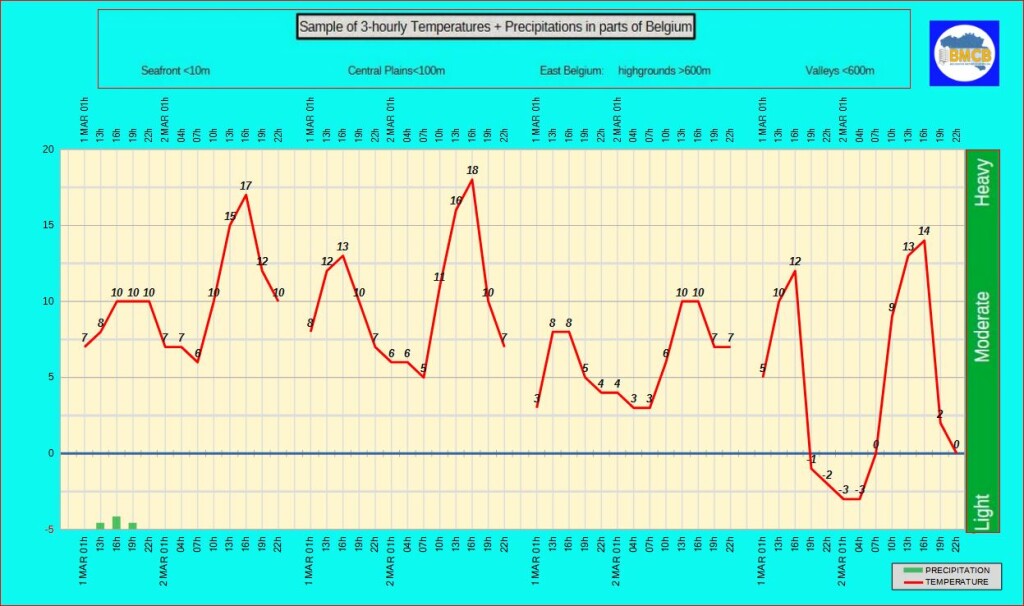 De maxima bereiken ongeveer 10°C aan de kust, 13 tot 14°C in het binnenland en 8 tot 12°C in de Ardennen.