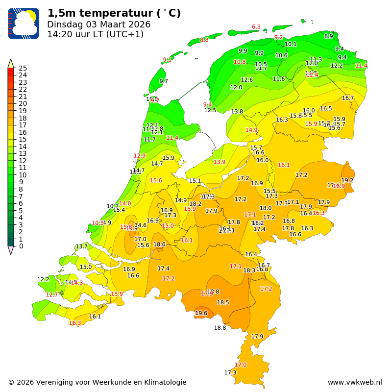 16,7°C net voor de NNO wind nu 12,1°C.
