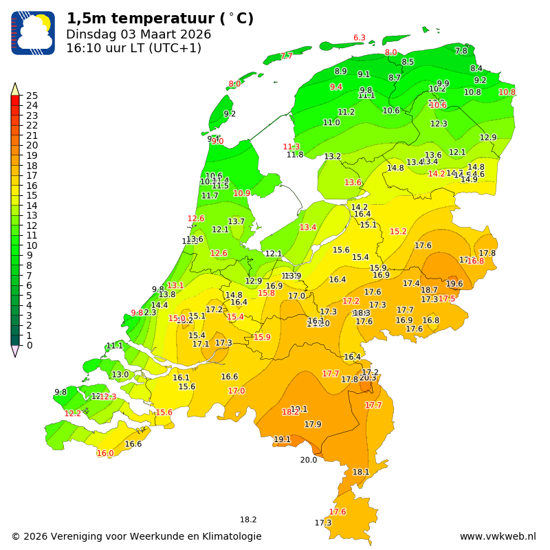 16,7°C net voor de NNO wind nu 12,1°C.