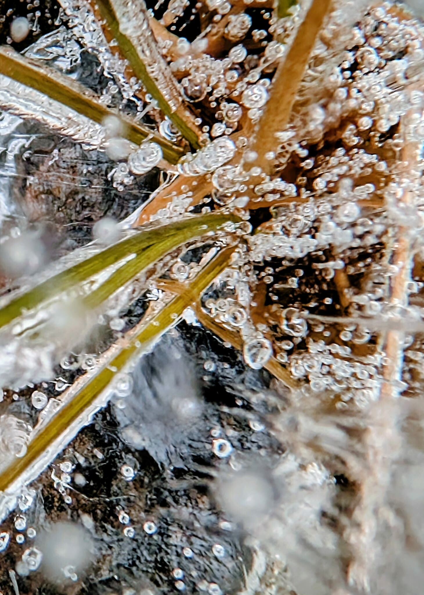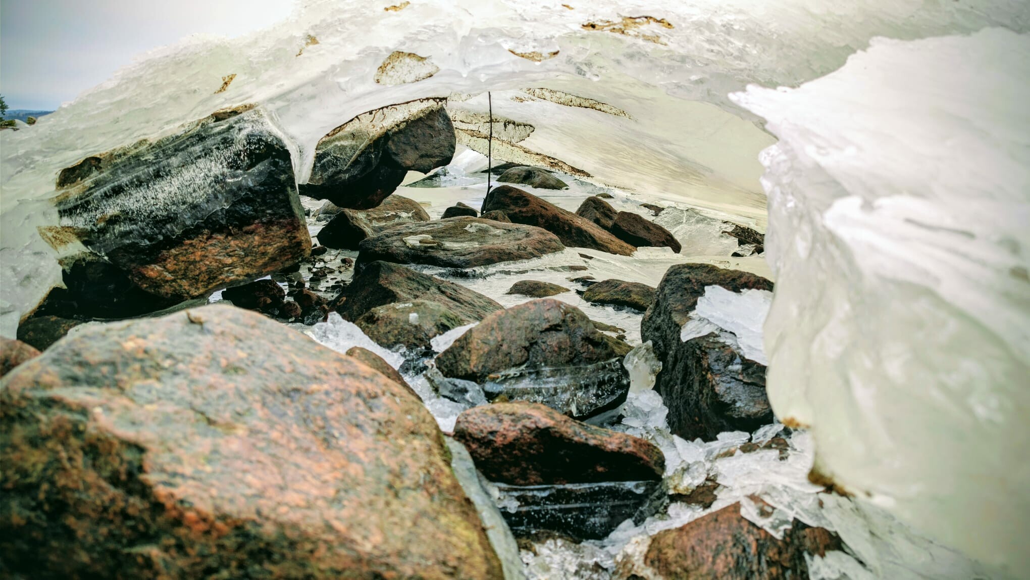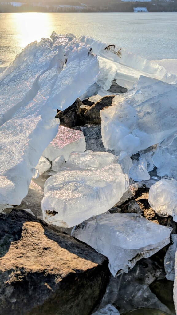 Ik weet nu hoe stenen meegenomen kunnen worden door het ijs. De stenen zitten vast en worden omhoog getrokken, prachtig om de ''ijsgrotten'' in te kijken! De waterplanten zijn nog in afwachting van de verdere dooi en staan volledig in het ijs, wat nog altijd 20-30cm dik is.