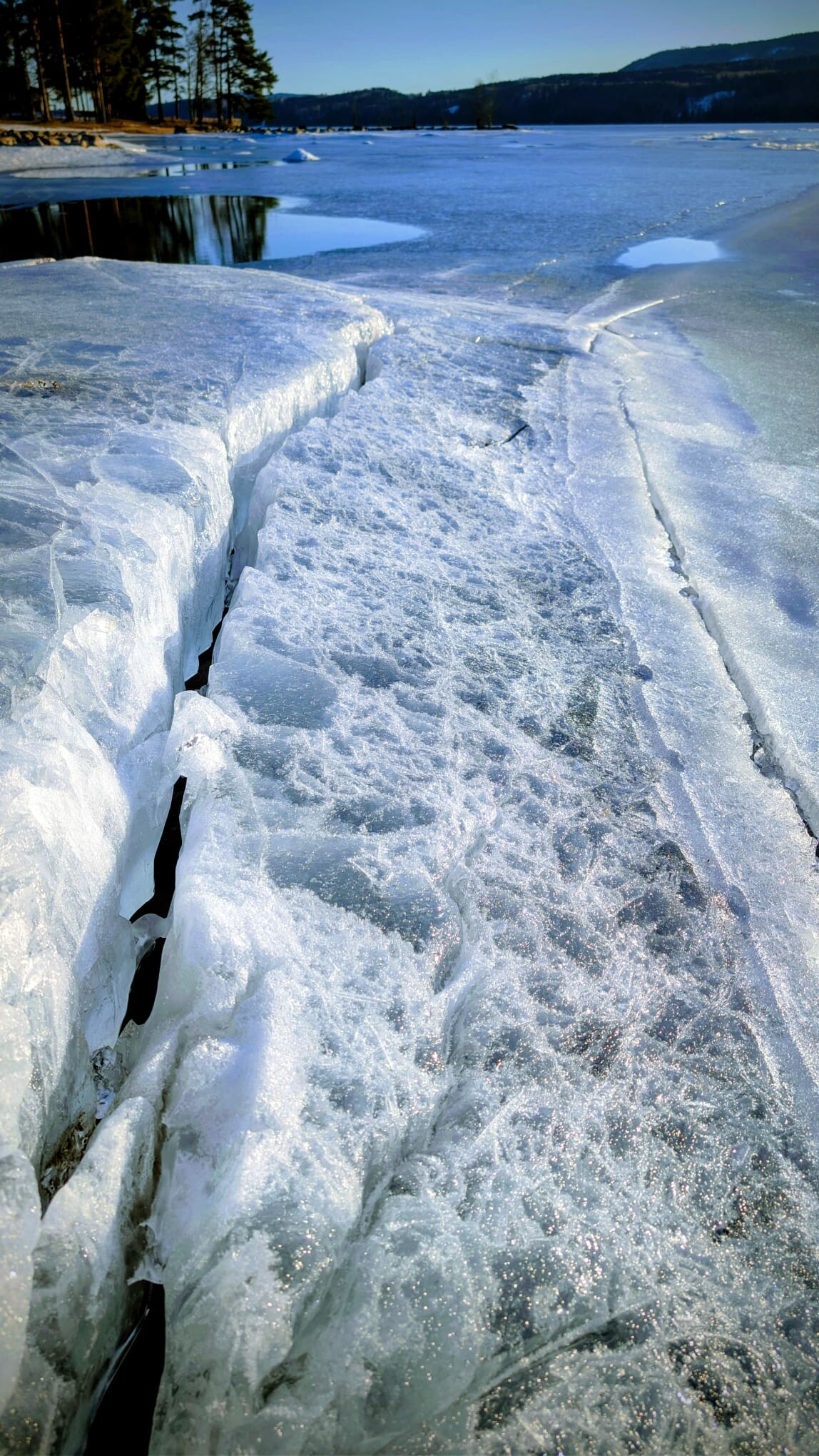 De waterstand daalt nog altijd, waardoor de scheuren groter worden en het ijs wegzakt vanaf de kanten, terwijl het ook probeert het land op te komen.