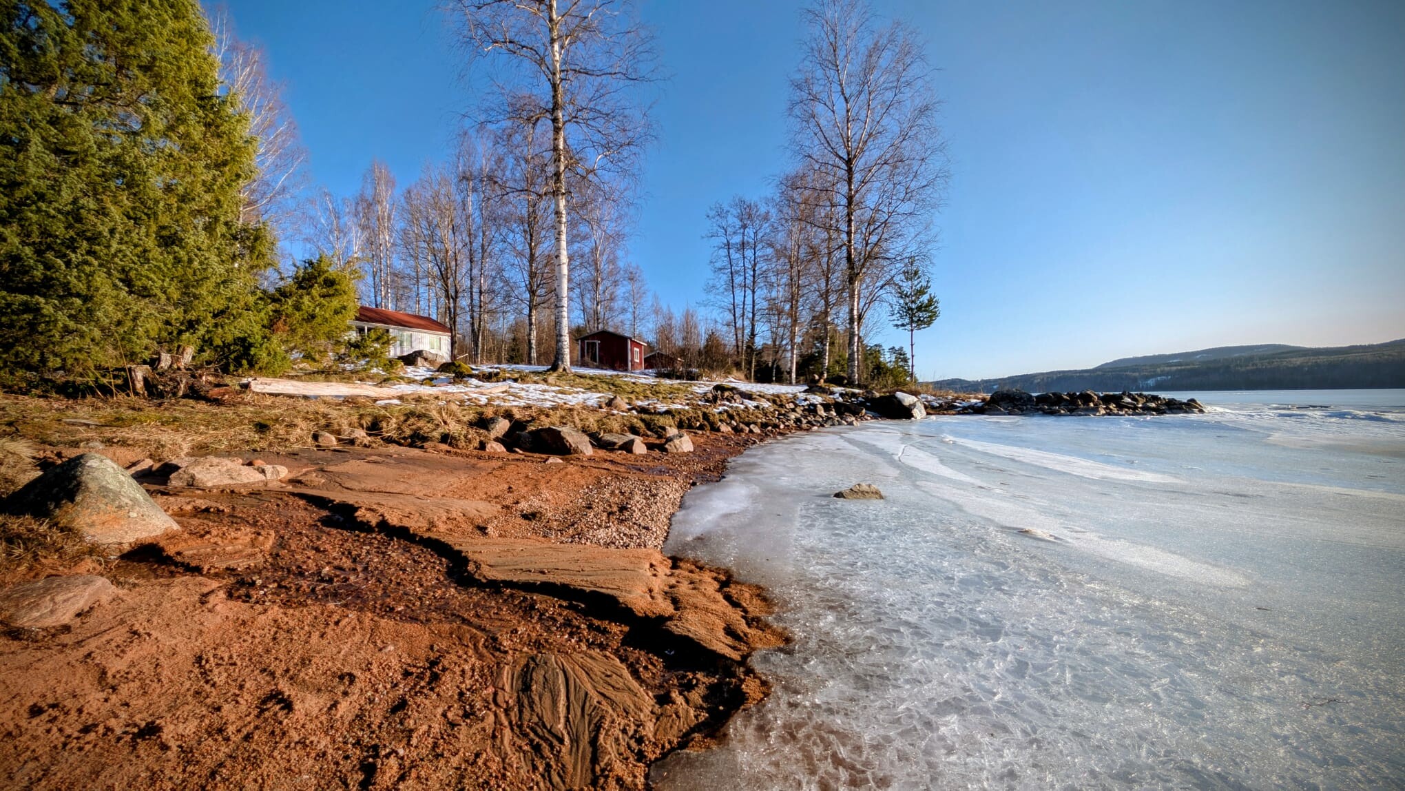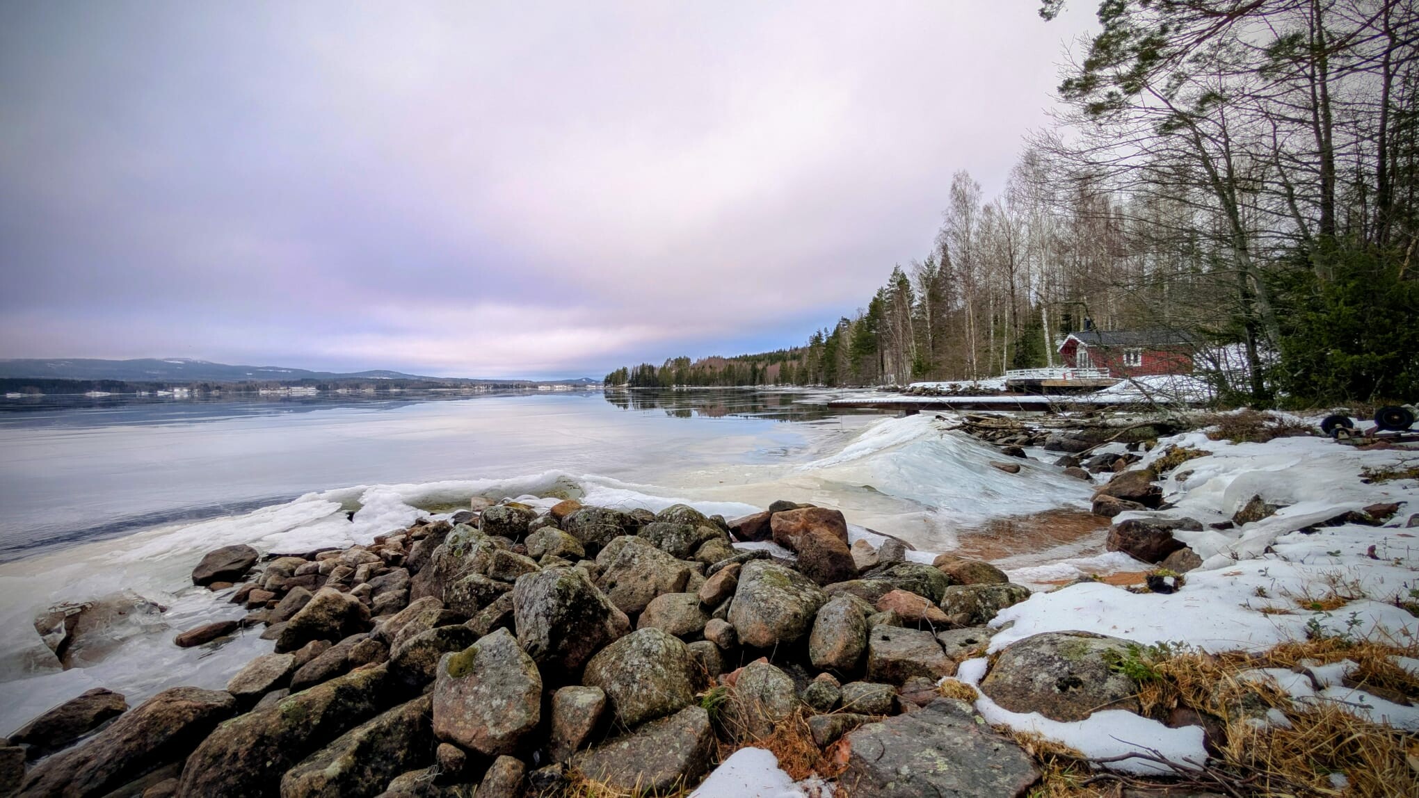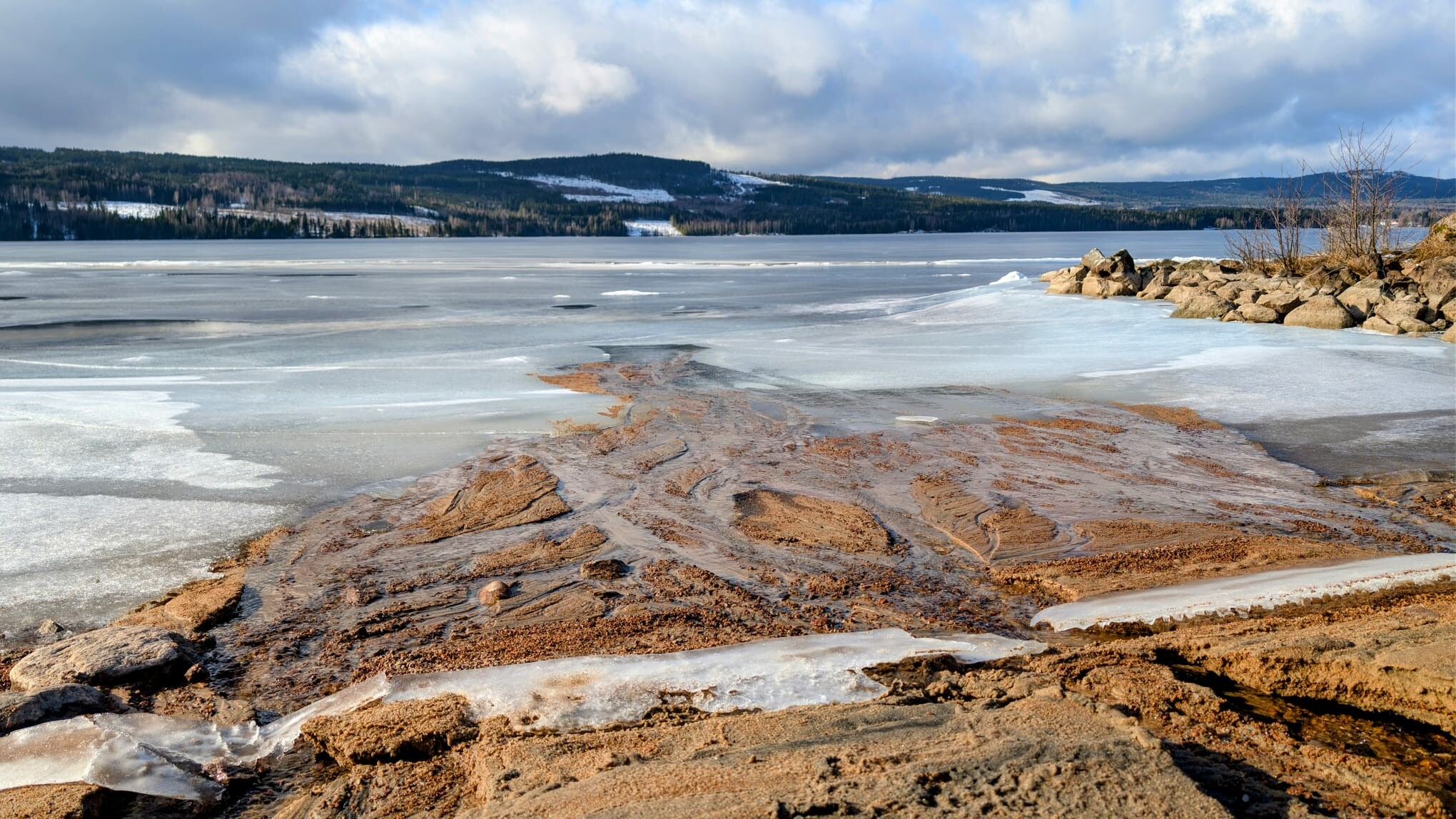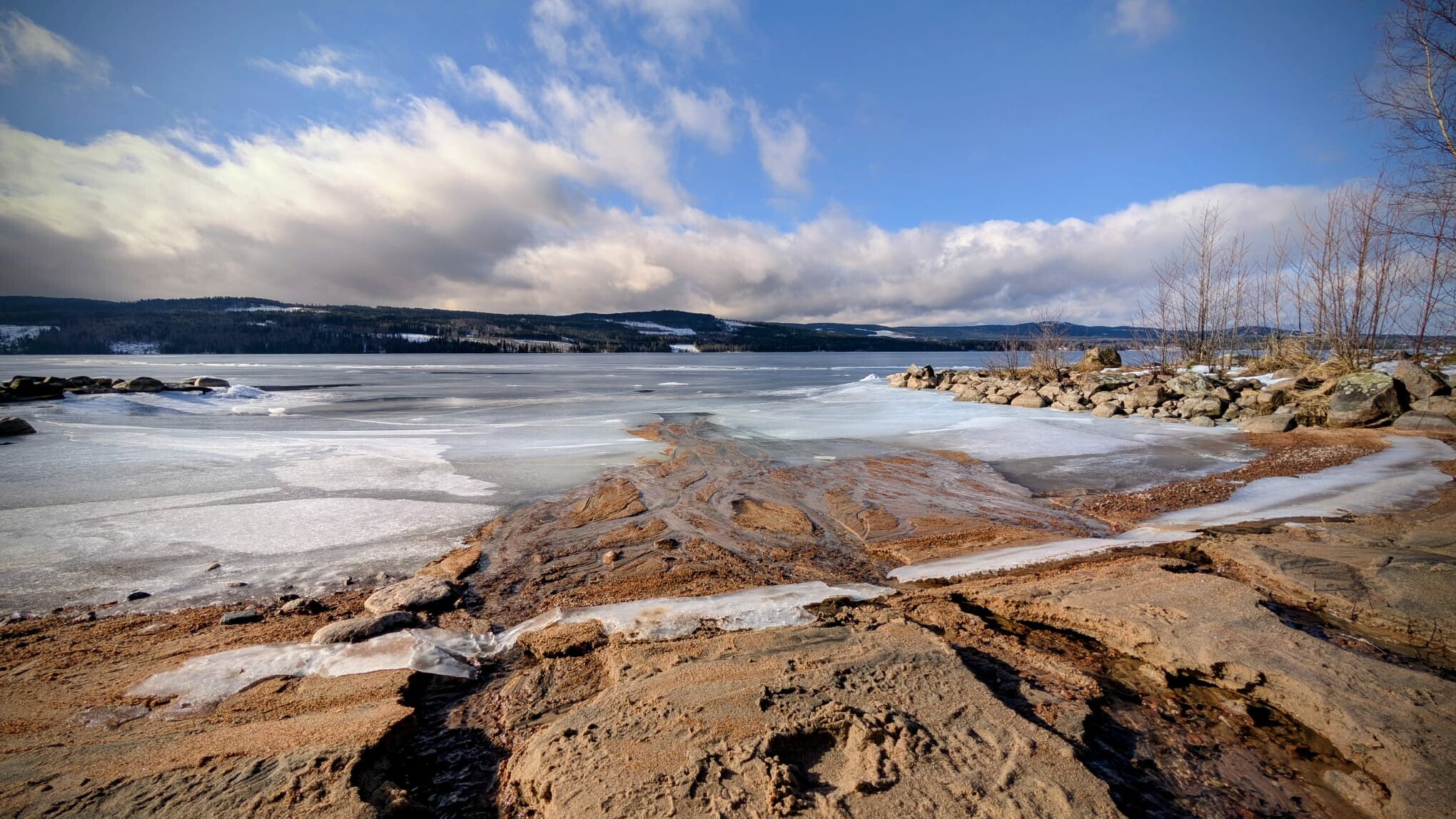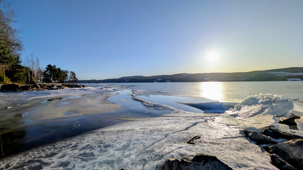 De winter lijkt hier plots voorbij met daarvoor in de plaats een vroeg voorjaar. Het heeft dit weekend nog gesneeuwd, met bovenop Hovfjället (550m) 10-15 cm verse sneeuw waar we nog van hebben kunen genieten afgelopen zondag. Daarna werd het vanaf gisteravond snel zachter met een opstekende wind. Vandaag begon met regen, wind en donker weer, maar in de loop van de middag brak de zon volledig door. Uiteindelijk een tmax van 6.7 graden, met nog altijd een redelijke wind uit het westen. De sneeuw smelt enorm snel en het water stroomde van de daken. Enerzijds fijn om weer zoveel licht te zien, maar eigenlijk is het wel weer veel te extreem deze langdurige omslag naar lente weer. In de zon was het heerlijk warm aan het water ijs. Het ijs dooit nu ook, vooral langs de kanten en door smeltwater wat gleuven in het ijs smelt door de talloze beekjes die nu het ijs opstromen. Het levert mooie plaatjes op