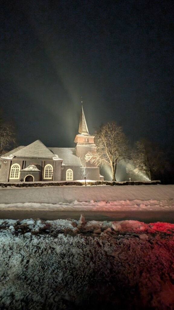 Laatste foto, de kerk van östmark, hier 20 km vandaan, tijdens sneeuwval afgelopen zaterdagavond.