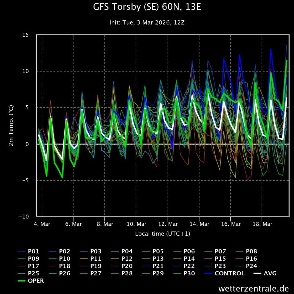 De GFS ensembles warmen steeds verder op. Later misschien wat meer regen, maar winter zit er (voorlopig) niet meer in.