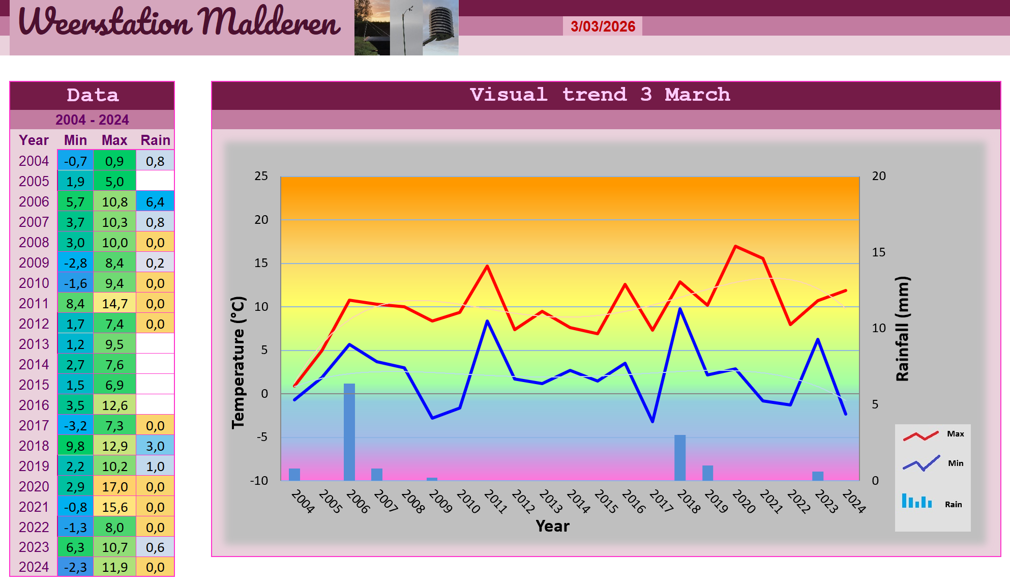 Vanochtend hadden we weer afspraak met ons vertrouwde Stratus wolkendek, zodat er een sombere en bedrukte sfeer heerste. Gelukkig duurde dat deze keer niet lang, en ging de bewolking na een uurtje haast ongemerkt over in Stratocumulus. Vervolgens ontstonden er vanuit het zuiden opklaringen die tijdelijk voor een vriendelijk lenteweertje zorgden bij temperaturen die zich tussen 3,0 en 10,0 graden ophielden. Het opruimwerk van de laaghangende wolken was echter opnieuw het resultaat van een naderende regenzone die de onderste luchtlagen door elkaar woelde. Het lenteweertje was dus geen lang leven beschoren, en vanuit het westen kwam er een chaotische wolkenmassa opzetten die de zon flink in de verdrukking bracht. Af en toe kreeg ze echter nog kansen om ons te verwarmen, want de bewolking bleek niet aaneengesloten te zijn. Ze zorgde zelfs voor erg fraaie uitzichten zodat de weersfotografen onder ons zich zeker niet hoefden te vervelen. Vooral Altocumulus lenticularis, Stratocumulus, Cumulus en Altostratus waren goed vertegenwoordigd. De wolkenband bleef geruime tijd haverwege het land steken, waardoor ze vooral in het zuidoosten nog konden genieten van brede opklaringen. Daar zorgde de warme zonnestraling na de middag echter voor convectieve bewolking zodat men er al evenmin voor een zonneslag hoefde te vrezen. Op het einde van de namiddag en vooral tijdens de avond kwam Malderen steeds meer in het windveld dat bij de regenzone hoorde, terecht. Dit zorgde uiteindelijk voor rukwinden tot 34,5 km/h uit het zuid- zuidwesten, al bleef de neerslag beperkt tot een paar verdwaalde druppels. Op het einde van dit etmaal was er dan ook niet meer dan 0,0 mm in de pluvio te vinden.