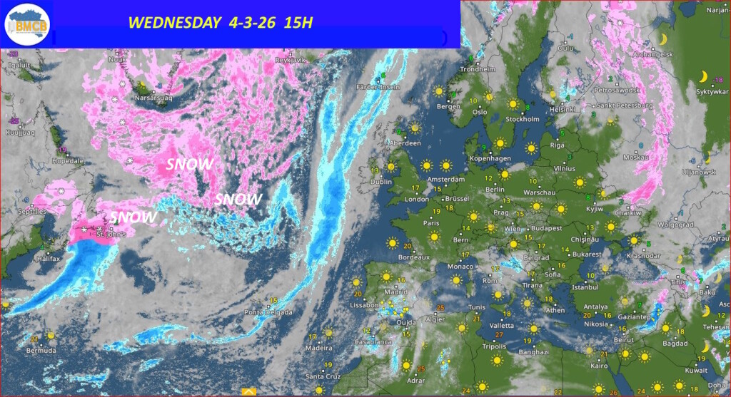 Tegelijkertijd is de situatie op onze breedtegraad boven de Atlantische Oceaan totaal anders: daar veroorzaakt zeer koude lucht afkomstig van het Noord-Amerikaanse continent winterse omstandigheden, met sneeuwval boven zee.