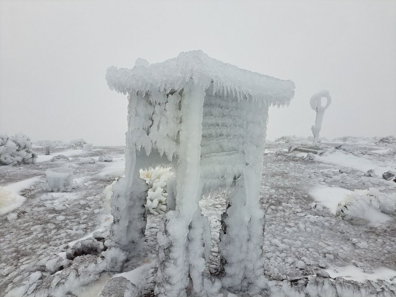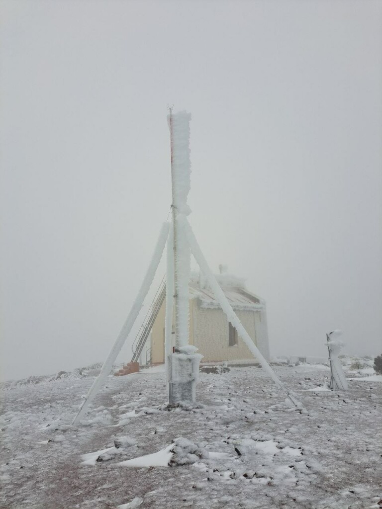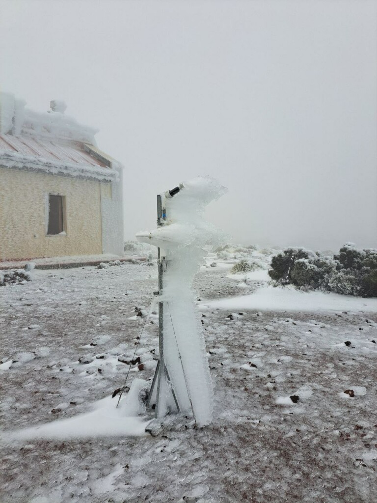Dat zijn toch bijzonder foto’s vanuit de Teide. Foto van AEMET van het weerstation op 2300 meter hoogte. Het is al een tijdje koud op de Teide met veel sneeuwcondities en afgesloten wegen. Sneeuwgrens zal nog wat gezakt zijn vandaag, naar zo’n 1700 meter. Ook op Gran Canaria en La Palma is daardoor sneeuw gevallen in de bergen..