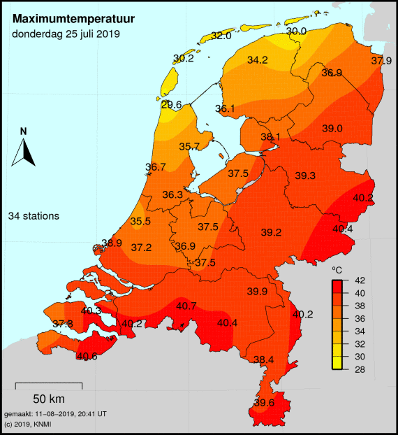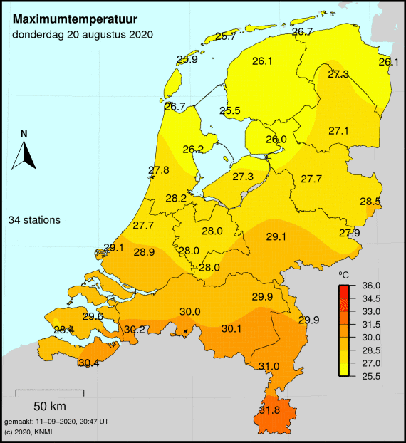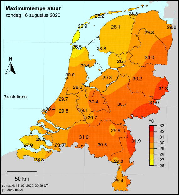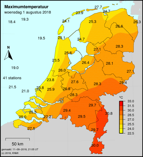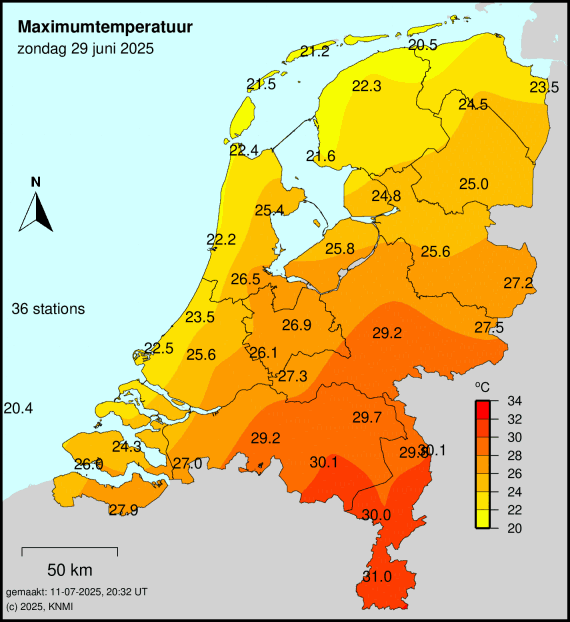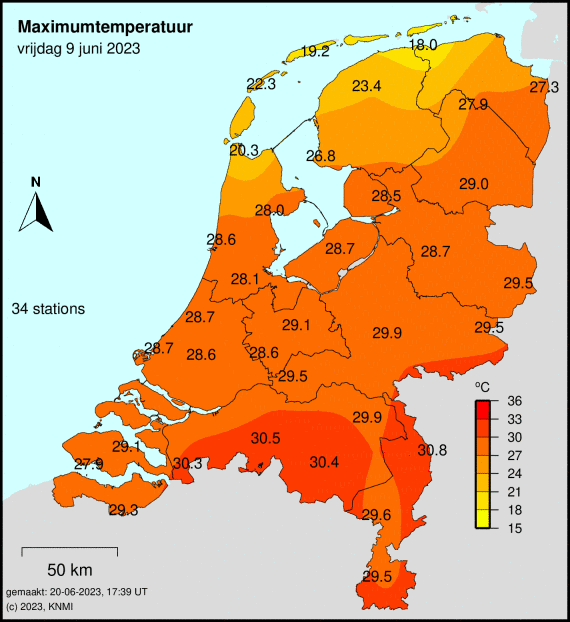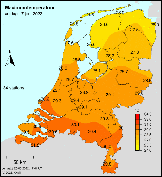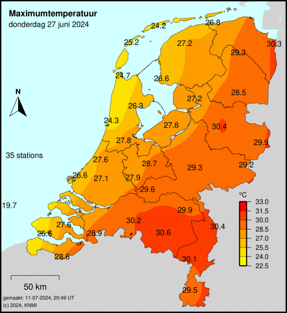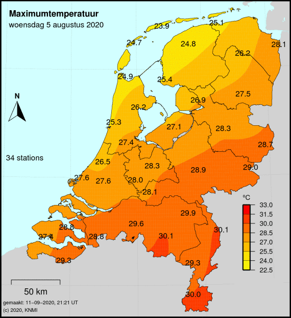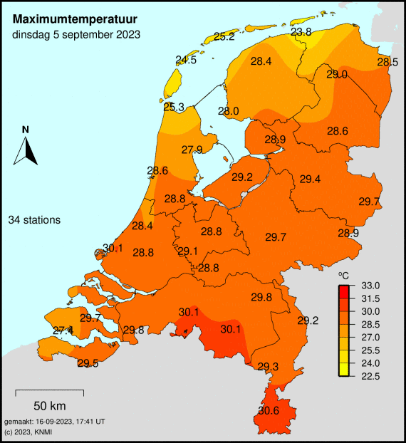 Meest toonaangevende voorbeeld voorop. Sinds 2022 jaarlijks in juni, ook jaarlijks wel eens in juli, augustus of september. Zelfs afgelopen augustus kwam het nog tot 3 dagen met een Tx van 29,5 of hoger maar beneden de 30,0 in Volkel.