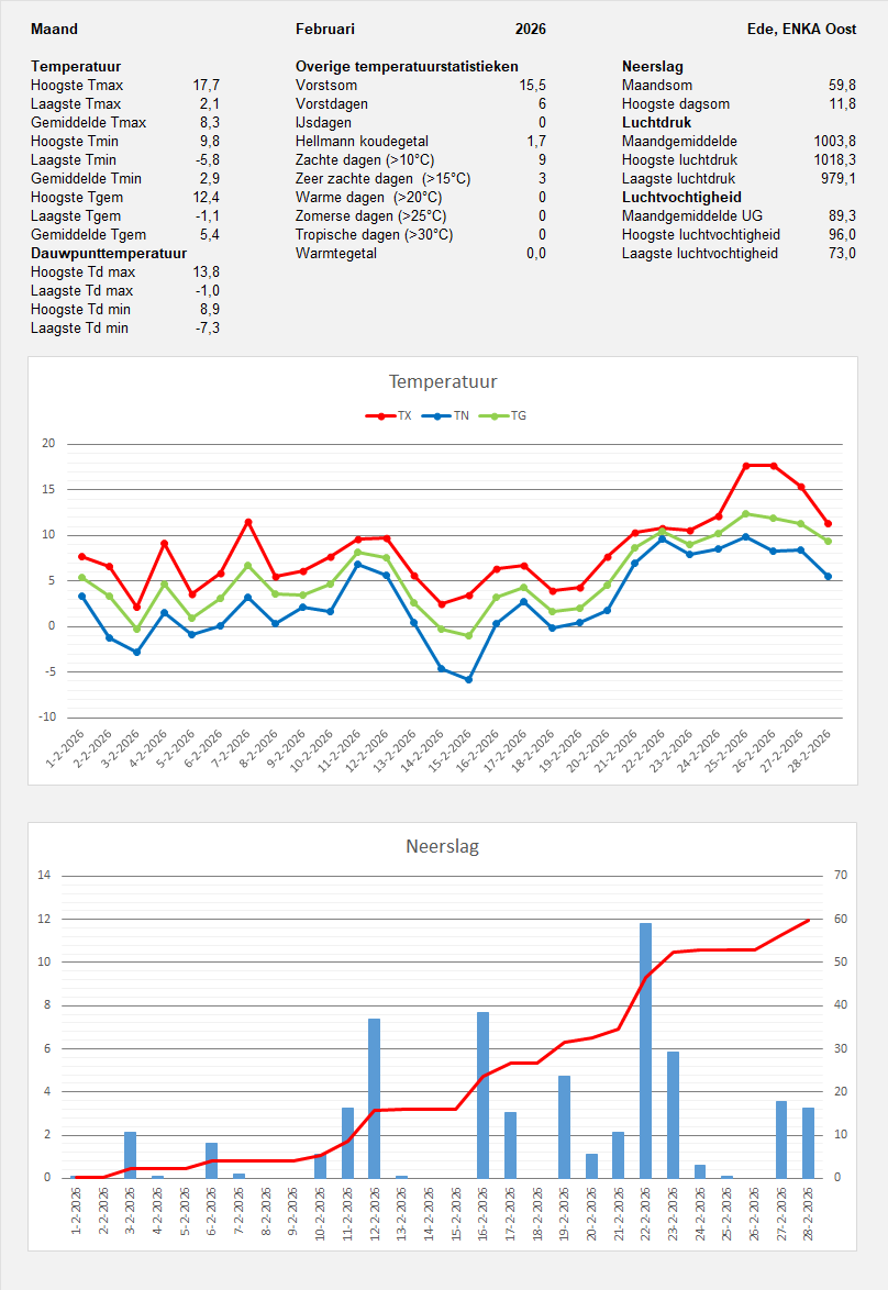 Hierbij nog even het maandoverzicht van mijn weerstation in de achtertuin. De maand februari was met een Tg van 5,4°C zacht, waarbij de temperatuur piekte met 17,7°C op zowel 25 als 26 februari. De laagste temperatuur werd op 15 februari bereikt met een Tn van -5,8°C en dat was tevens de enige nacht met matige vorst. De neerslag was met 59,8mm maar iets beneden het klimatologische gemiddelde van KNMI station Deelen (hemelsbreed 15km verderop). Zonneschijn heb ik hier niet in staan, maar ik zie dat de zonnepanelen (geïnstalleerd juli 2019) alleen in februari 2020 en 2024 minder energie opgewekt hadden dan in afgelopen februari.
