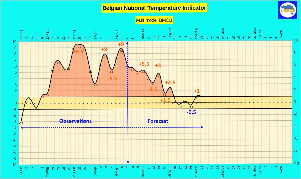 Vanaf 14 maart wijst de tendens echter op een nieuwe daling van de nationale index, mogelijk tussen +3 en –1.